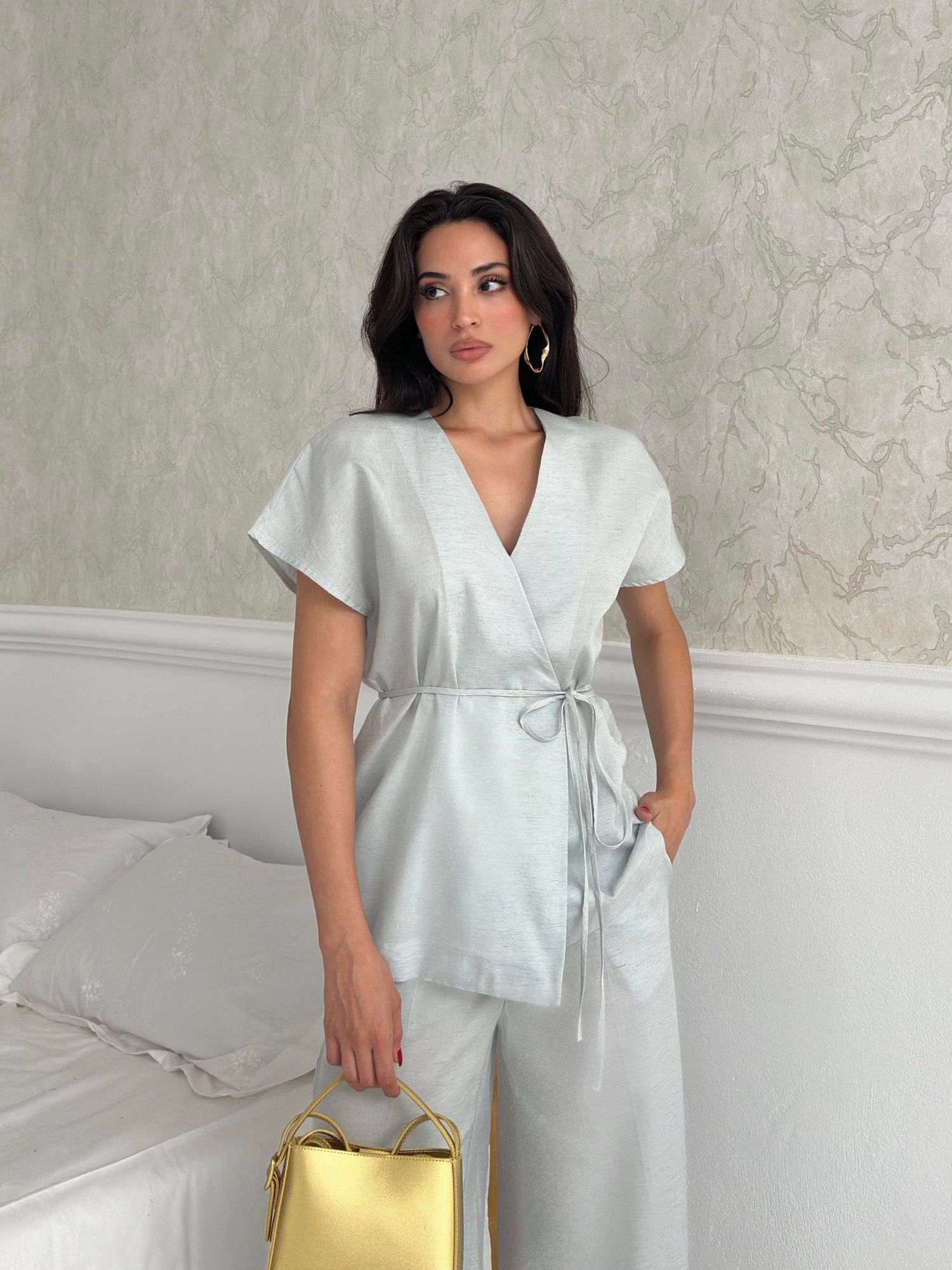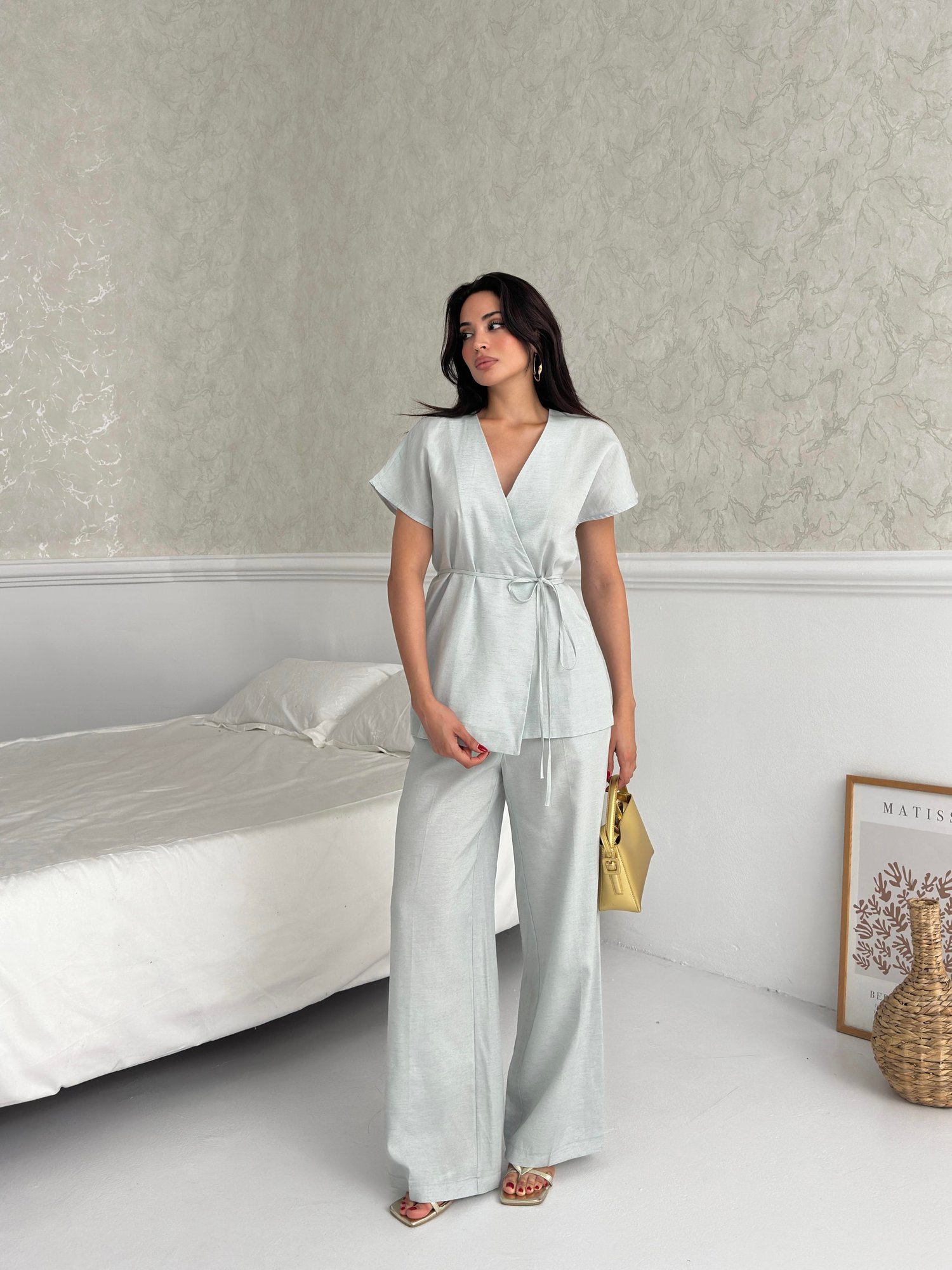 Açık Mavi Kruvaze Bluz  İspanyol Paça Pantolon Takım