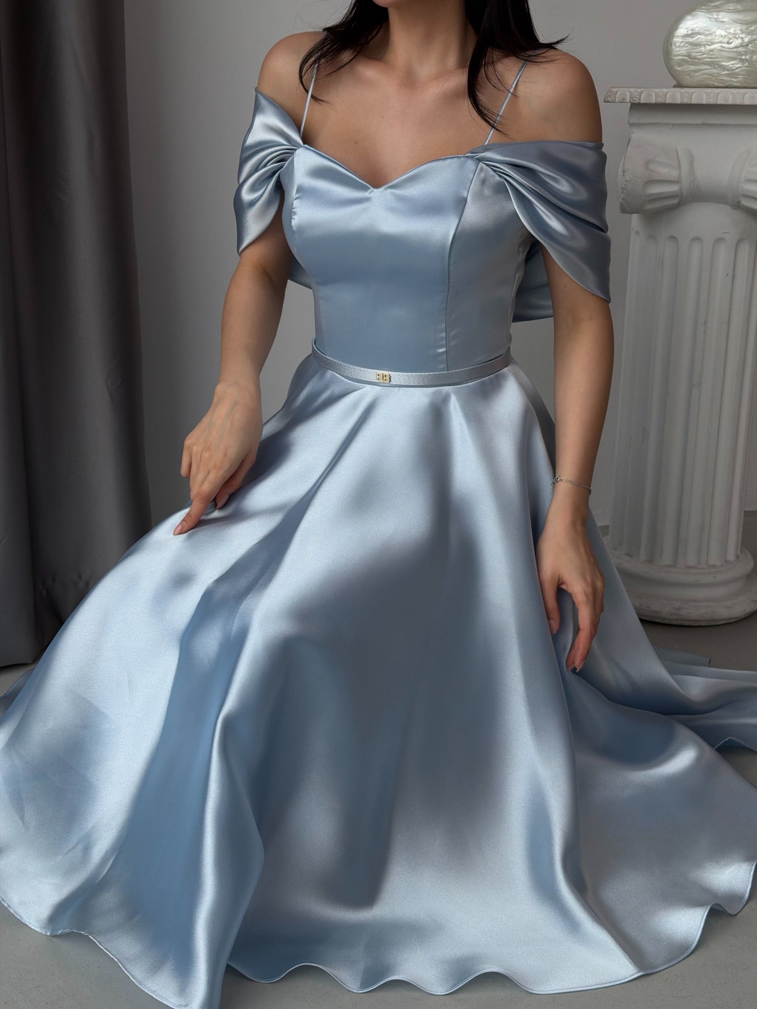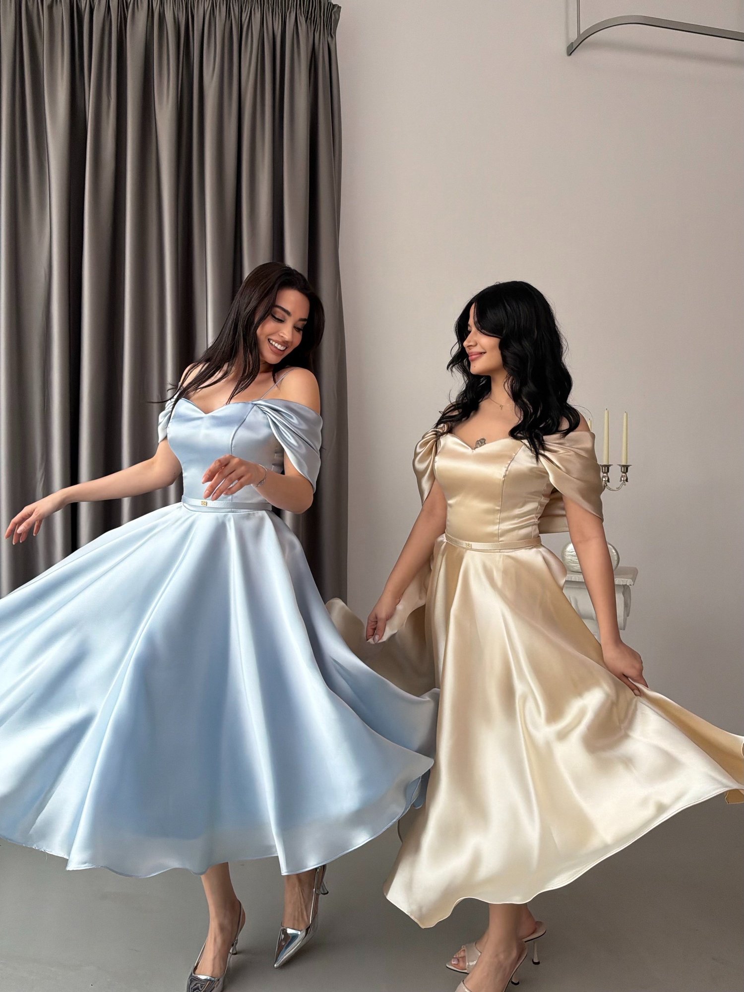 Zarif ve göz alıcı tasarımıyla öne çıkan bu midi boy abiye elbise, ışıltılı dokusu ve feminen kesimiyle dikkat çeker. Düşük omuz (off-shoulder) yaka detayı omuz hattını romantik bir şekilde vurgularken, kalp yaka formu dekolteyi zarifçe ön plana çıkarır. Belden oturtmalı yapısı ve geniş açılan kloş etek formu, hareketli ve dengeli bir siluet oluşturur. Parlak ve akışkan yüzeyi sayesinde her adımda ışığı yansıtarak etkileyici bir görünüm sunar.