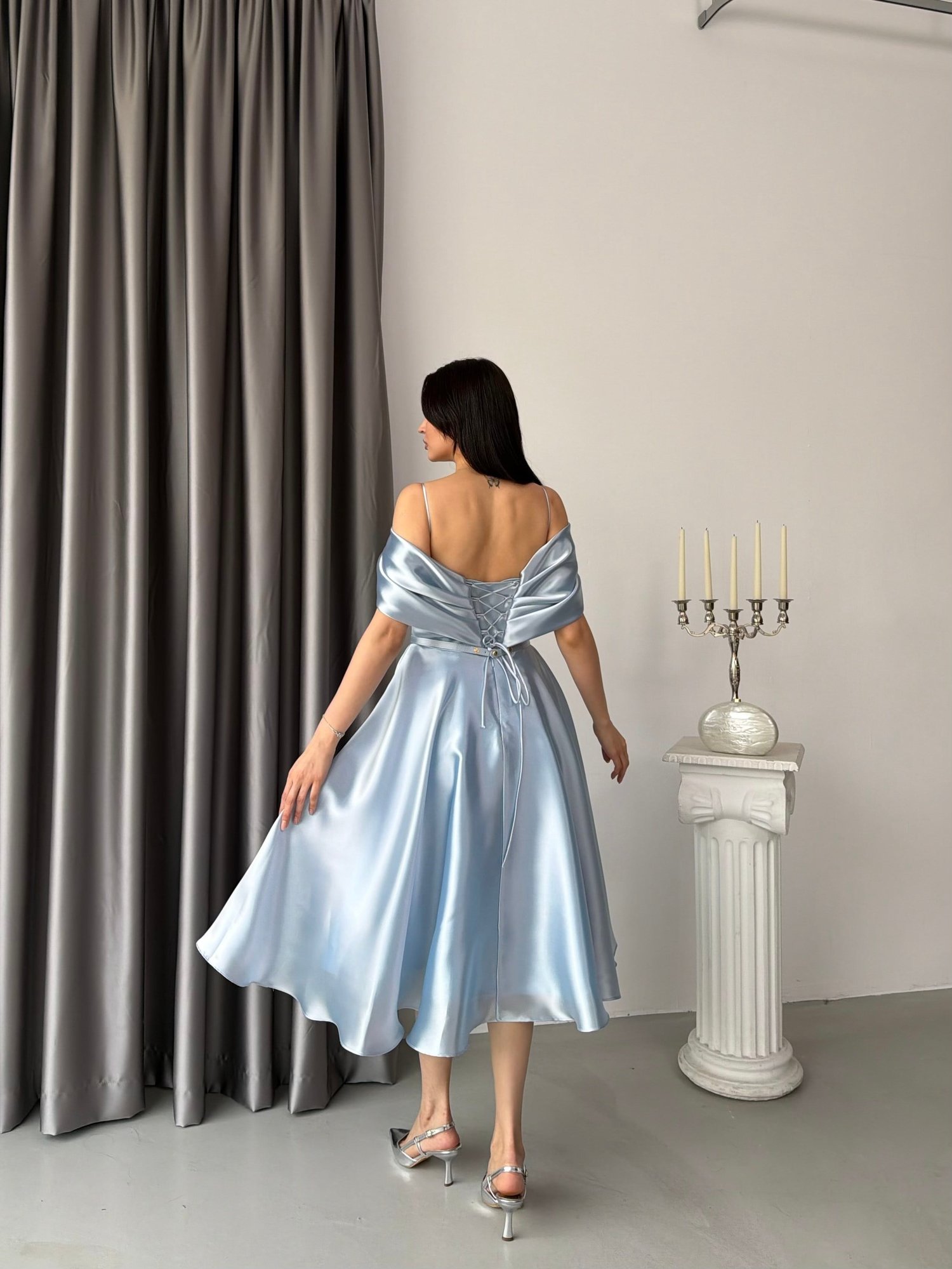 Bebe Mavi Askılı Düşük Kol Kemer Detaylı Organze Midi Elbise