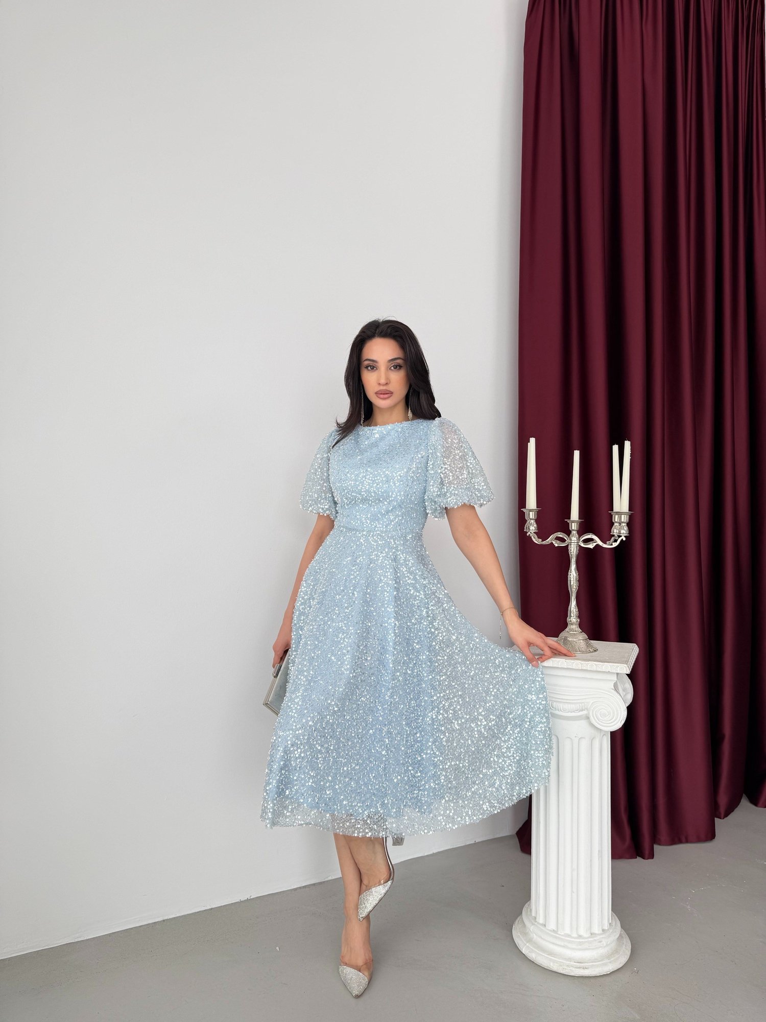 Bebe Mavi Balon Kol Bisiklet Yaka Pul Payetli Abiye Elbise