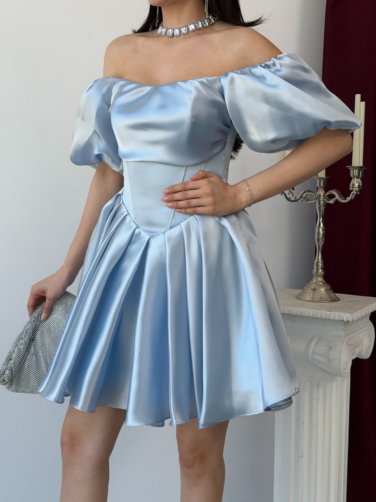 Işıltılı ve iddialı tasarımıyla öne çıkan bu mini abiye elbise, modern prenses siluetiyle dikkat çeker. Düşük omuz (off-shoulder) yaka detayı ve hacimli balon kollar omuz hattını zarifçe vurgularken, korse formundaki üst beden vücudu toparlayarak kusursuz bir görünüm sunar. Belden itibaren genişleyen volanlı etek yapısı hareketli ve feminen bir duruş kazandırır. Parlak saten dokusu sayesinde ışığı yansıtarak göz alıcı bir etki yaratır.