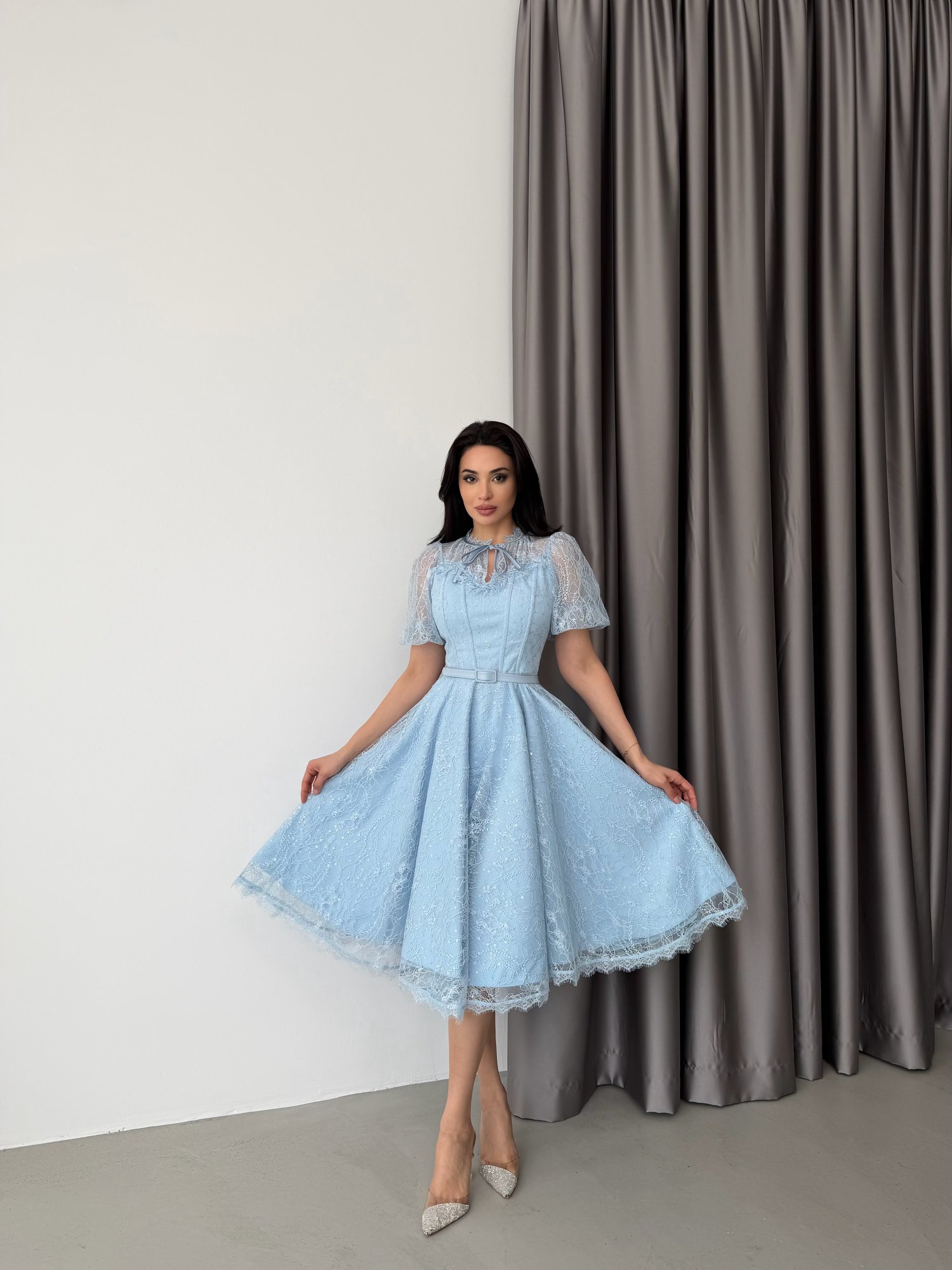 Romantik ve zarif detaylarıyla öne çıkan bu midi boy abiye elbise, feminen silueti ve hafif yapısıyla göz alıcı bir görünüm sunar. Dantel dokulu kumaşı ve kısa balon kol tasarımı, elbiseye yumuşak ve zarif bir hava katarken; yaka kısmındaki bağcık detayı nostaljik ve şık bir dokunuş sağlar. Bel kısmındaki kemer detayı vücut formunu dengeli şekilde vurgularken, diz altına uzanan dökümlü etek yapısı hareketli ve zarif bir duruş kazandırır.