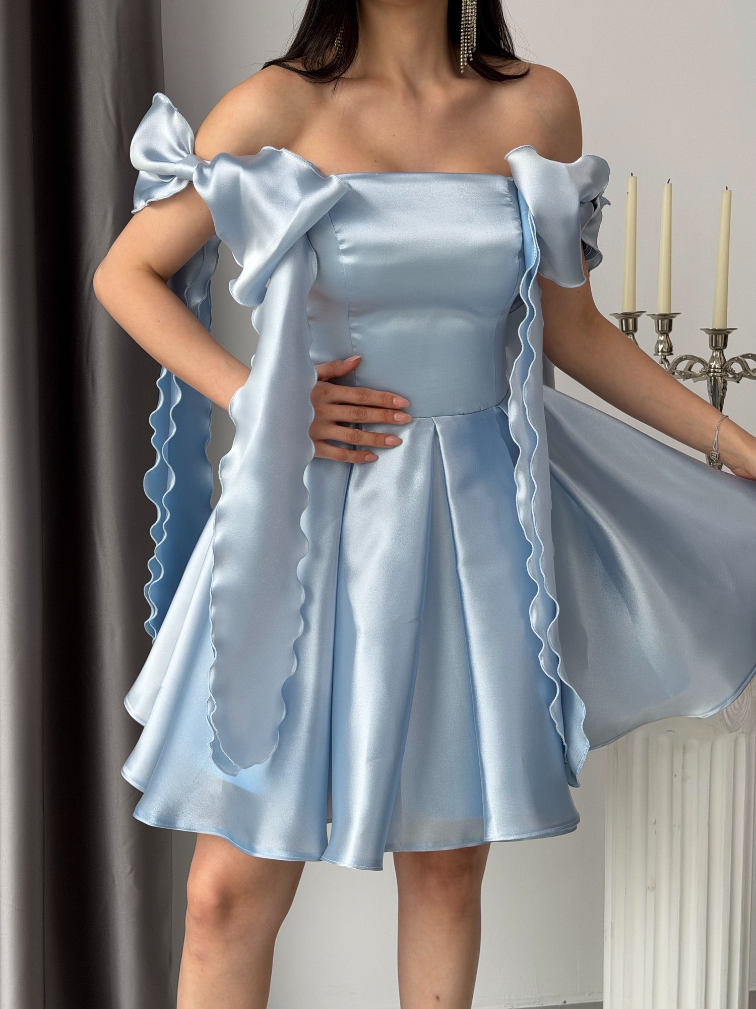Zarif ve dikkat çekici tasarımıyla öne çıkan bu kısa abiye elbise, modern çizgileri ve hacimli detaylarıyla güçlü bir stil sunar. Kare yaka formu dekolteyi sade ve şık bir şekilde vurgularken, omuzlardan aşağı doğru uzanan volanlı fırfır detayları tasarıma hareket ve sofistike bir hava katar. Belden oturtmalı yapısı ve kloş etek formu feminen bir siluet oluştururken, saten görünümlü parlak yüzeyi elbiseye göz alıcı bir ışıltı kazandırır.