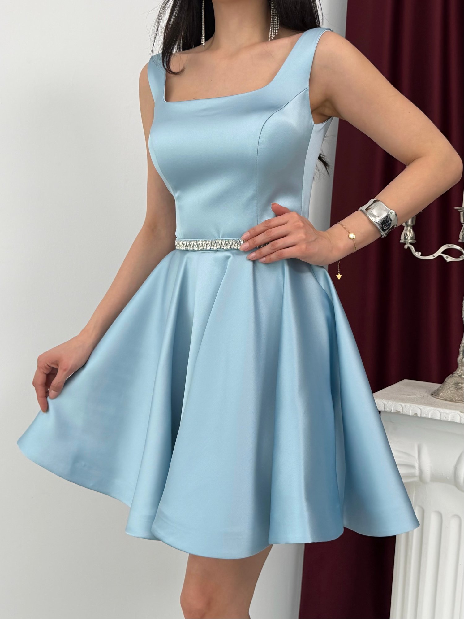 Bebe Mavi Kare Yaka Kemer Detaylı Saten Abiye Elbise