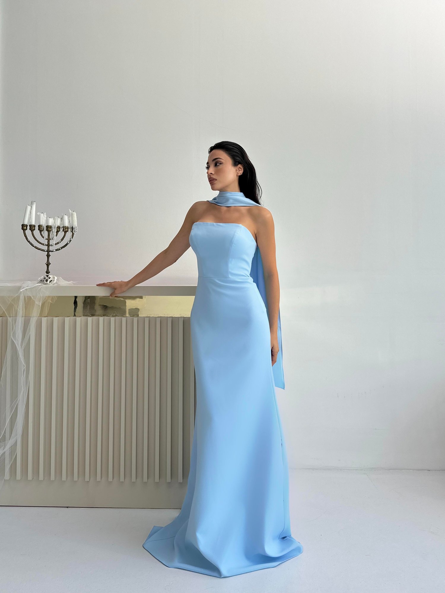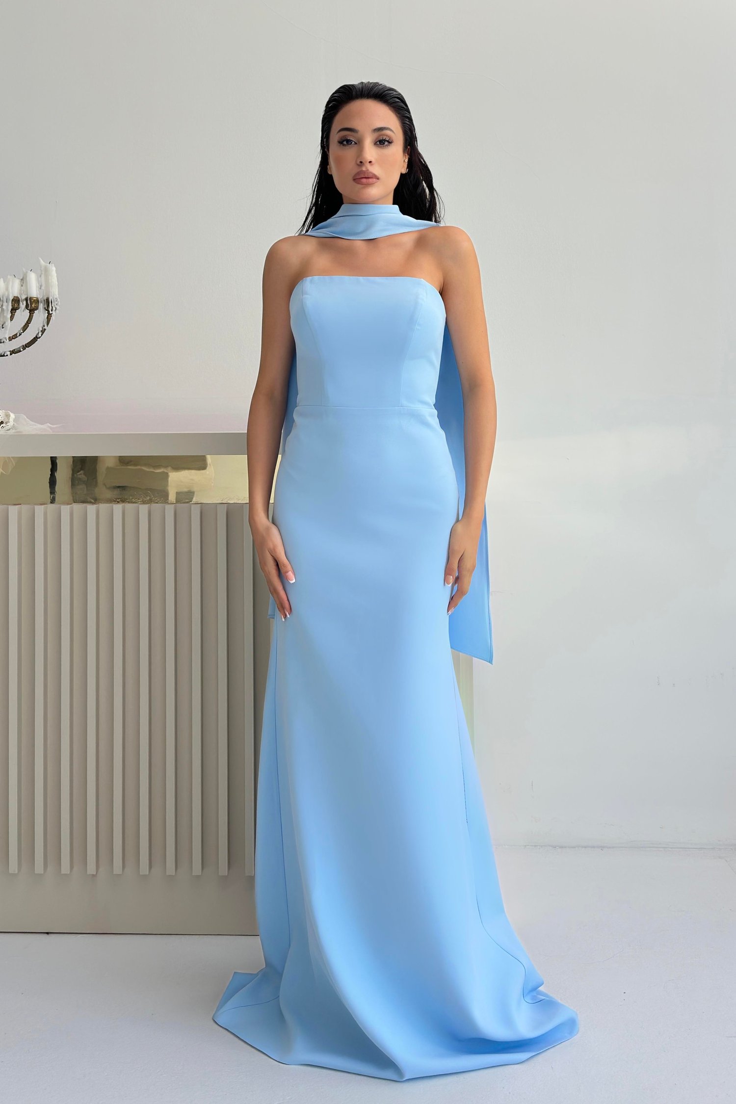 Bebe Mavi Şal Yaka Detaylı Straplez Abiye Elbise