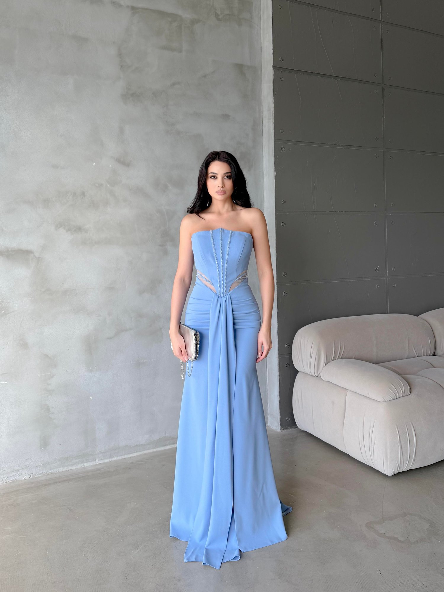 Bebe Mavi Straplez Transparan Bel Detaylı Taşlı Yırtmaçlı Abiye Elbise