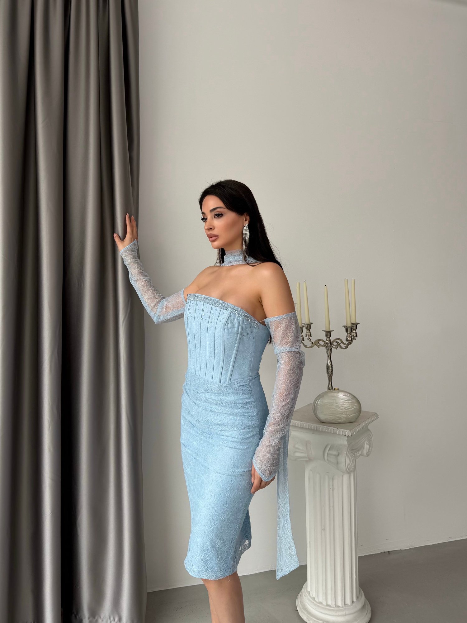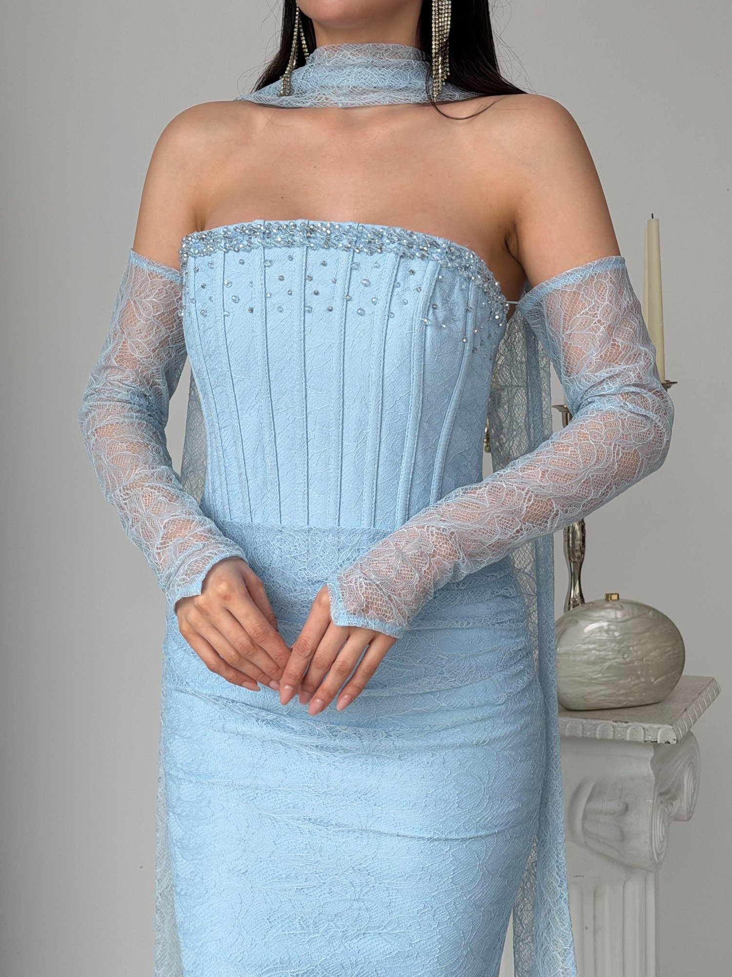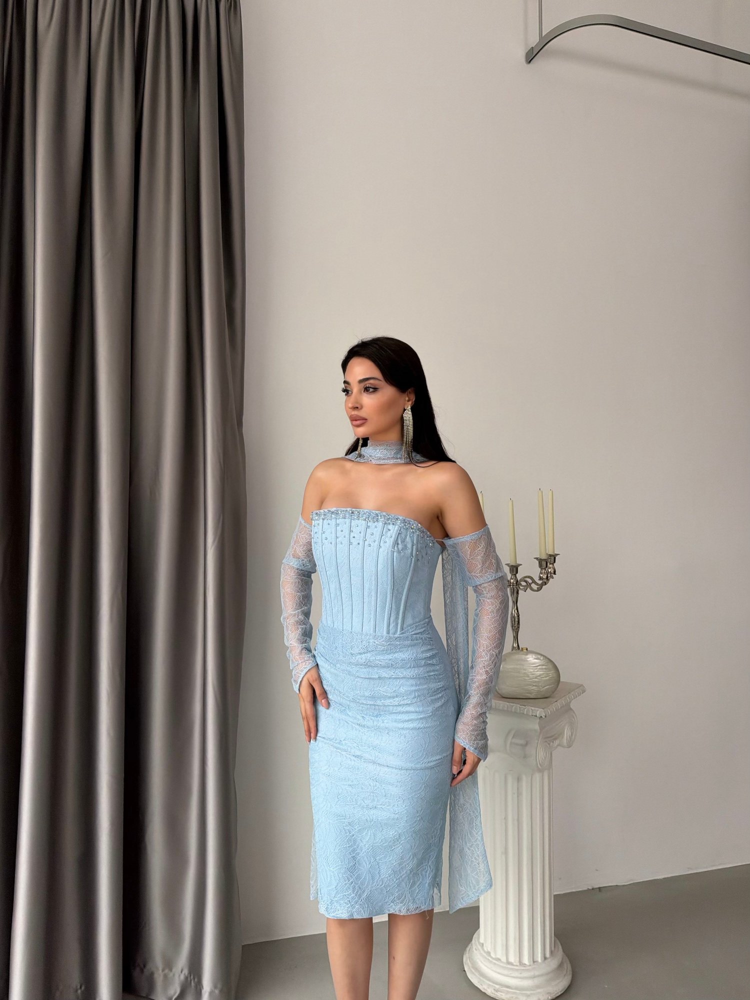 Bebe Mavi Taş İşlemeli Fularlı Eldivenli Dantel Midi Abiye Elbise