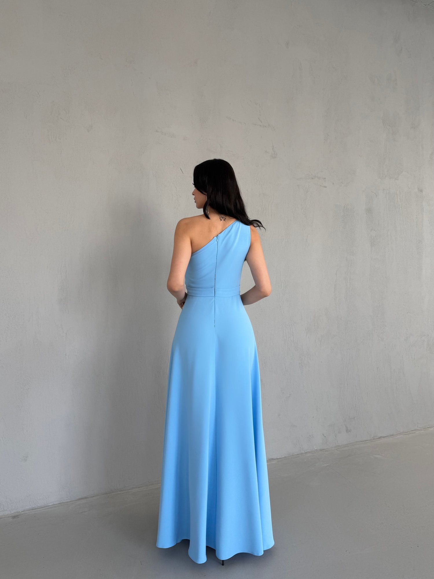 Kombin Önerisi: Gümüş tonlu ince bantlı topuklu ayakkabılar ve minimal takılarla tamamlanması önerilir. Tek omuz detayı ön planda olduğu için uzun ve zarif küpeler tercih edilebilir. Küçük metalik veya saten bir clutch çanta kombin bütünlüğünü güçlendirir.