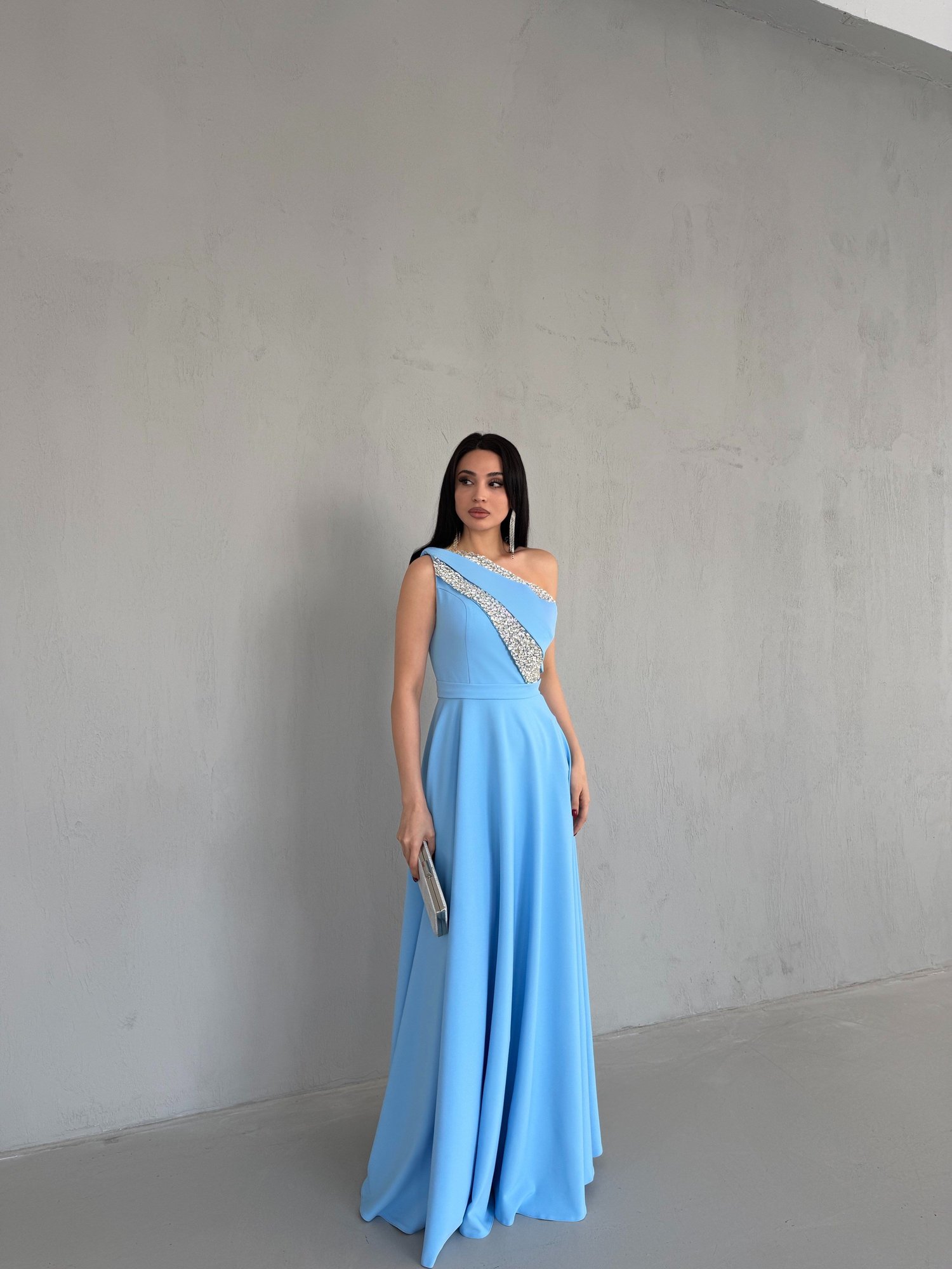 Ürün Açıklaması Tek omuzlu modern kesimi ve göğüs kısmında yer alan çapraz taş işlemeli bant detaylarıyla öne çıkan bu abiye elbise, zarif ve sofistike bir siluet sunar. Üst bedeni formda şekilde sararken belden itibaren A kesim olarak aşağı doğru akıcı biçimde dökülen eteği, hem dengeli hem de asil bir duruş sağlar. Minimal ama etkileyici tasarımı sayesinde özel davetlerde güçlü bir şıklık yaratır.