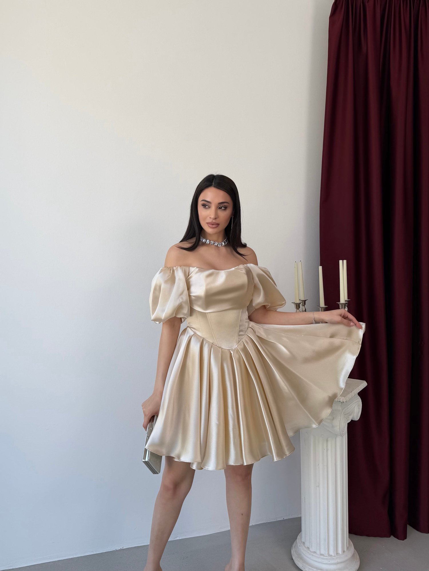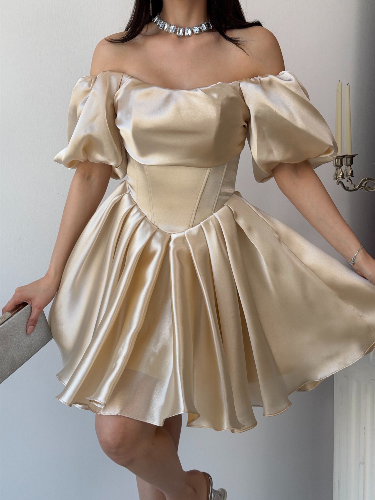 Işıltılı ve iddialı tasarımıyla öne çıkan bu mini abiye elbise, modern prenses siluetiyle dikkat çeker. Düşük omuz (off-shoulder) yaka detayı ve hacimli balon kollar omuz hattını zarifçe vurgularken, korse formundaki üst beden vücudu toparlayarak kusursuz bir görünüm sunar. Belden itibaren genişleyen volanlı etek yapısı hareketli ve feminen bir duruş kazandırır. Parlak saten dokusu sayesinde ışığı yansıtarak göz alıcı bir etki yaratır.