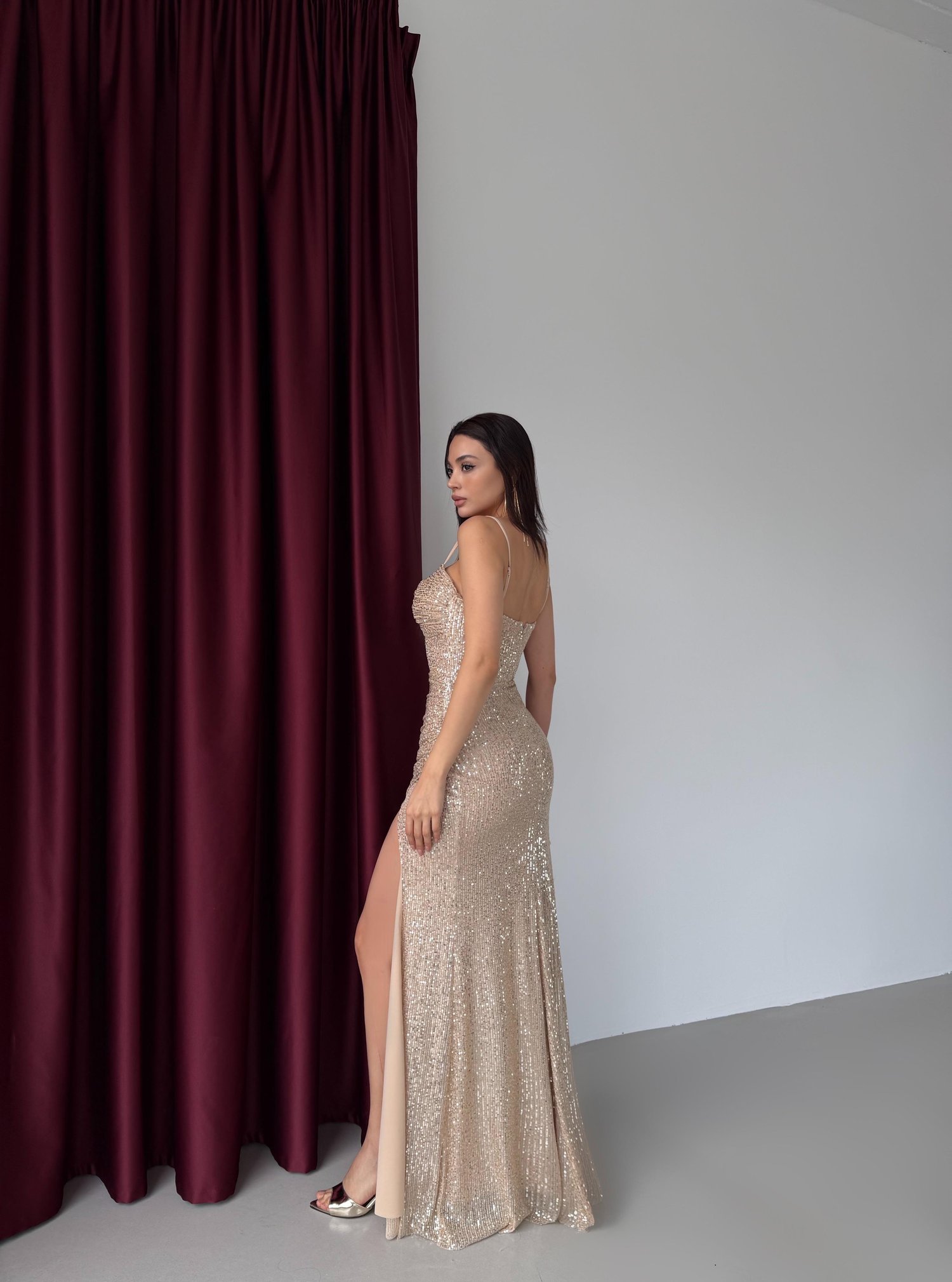 Bej İnce Askılı Yırtmaçlı Pul Payet Abiye Elbise