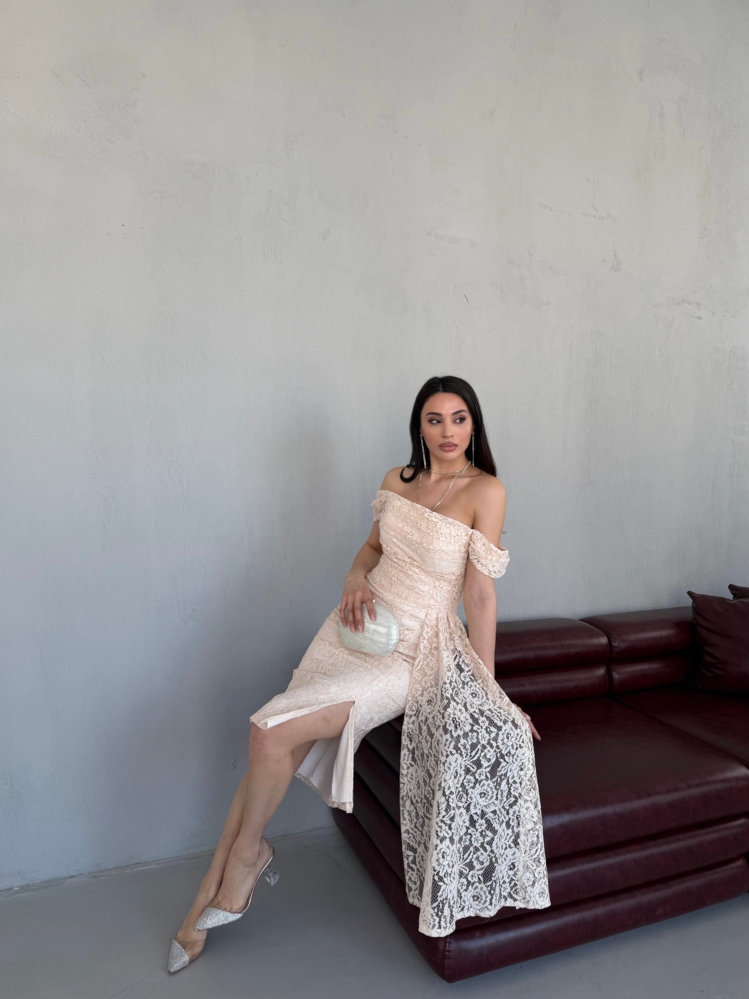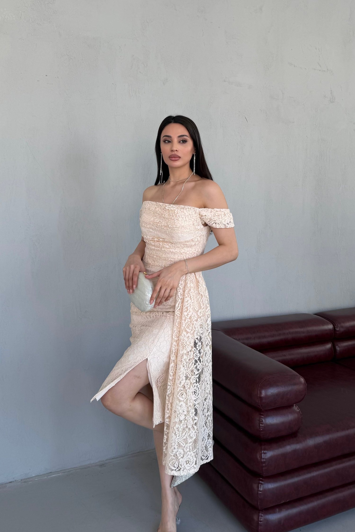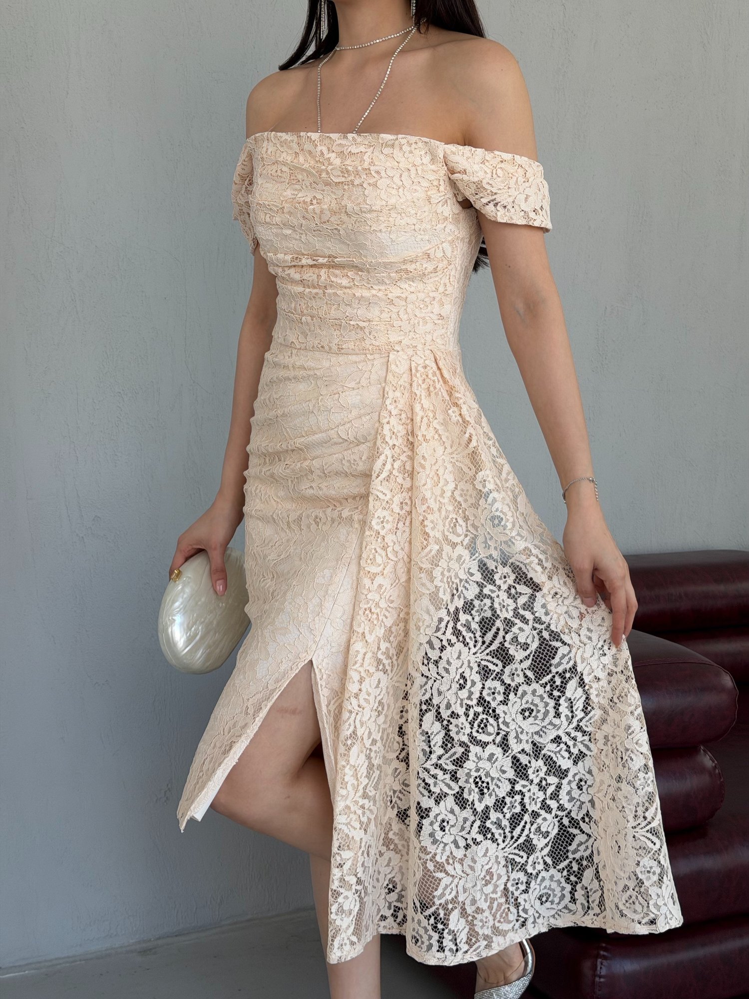 Zarif dantel dokusu ve modern kesimiyle öne çıkan bu midi boy abiye elbise, feminen ve sofistike bir görünüm sunar. Düşük omuz (off-shoulder) yaka detayı omuz hattını zarifçe vurgularken, vücuda oturan formu silueti kusursuz şekilde sarar. Etek kısmındaki yırtmaç detayı hareket özgürlüğü sağlarken, yan bölümde yer alan uzun dantel kuşak detayı tasarıma farklı ve dikkat çekici bir hava katar. Özel davetlerde sade ama etkileyici bir şıklık arayanlar için ideal bir seçimdir.