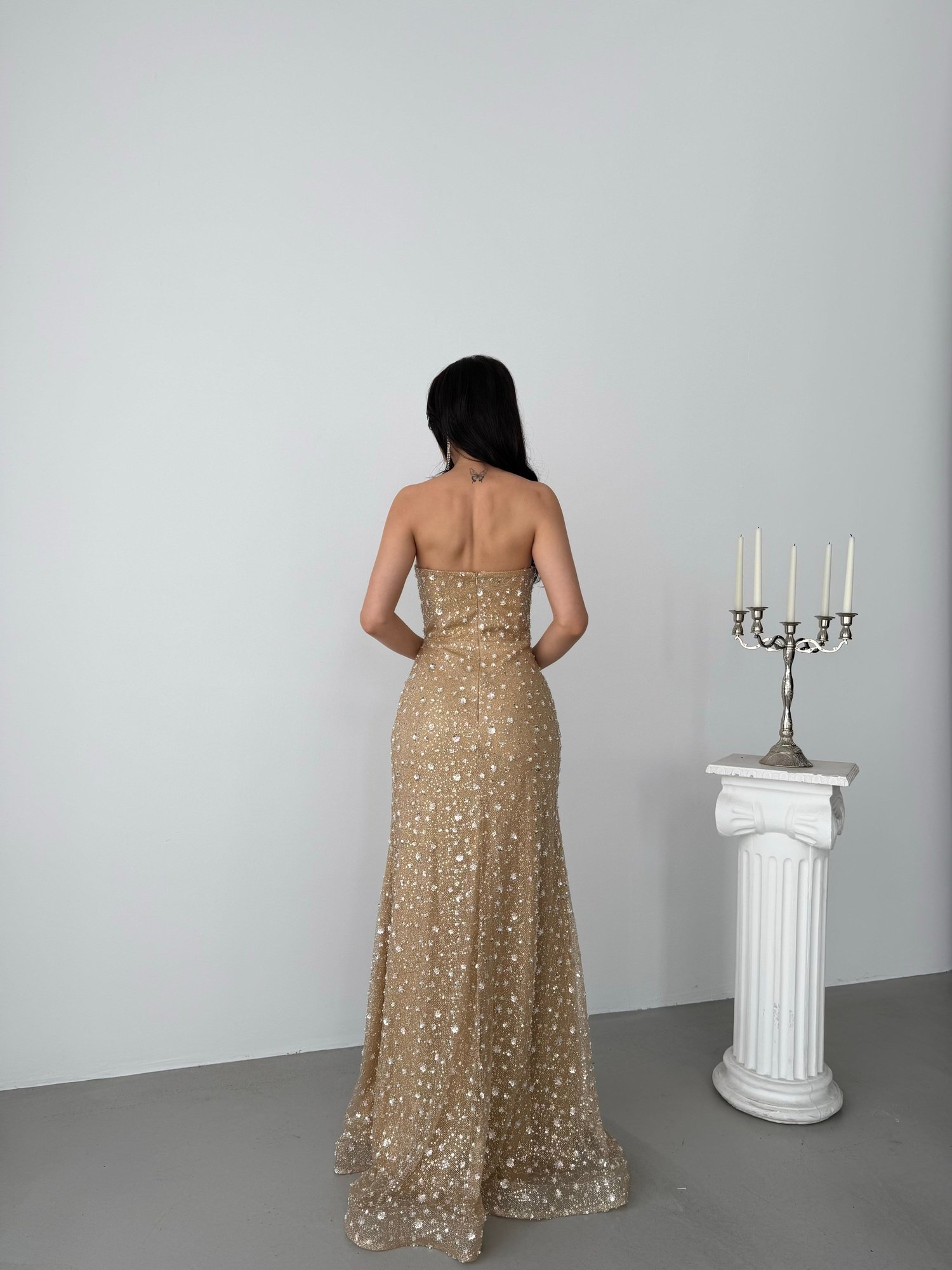 Bej Pul Payetli Straplez Balık Abiye Elbise