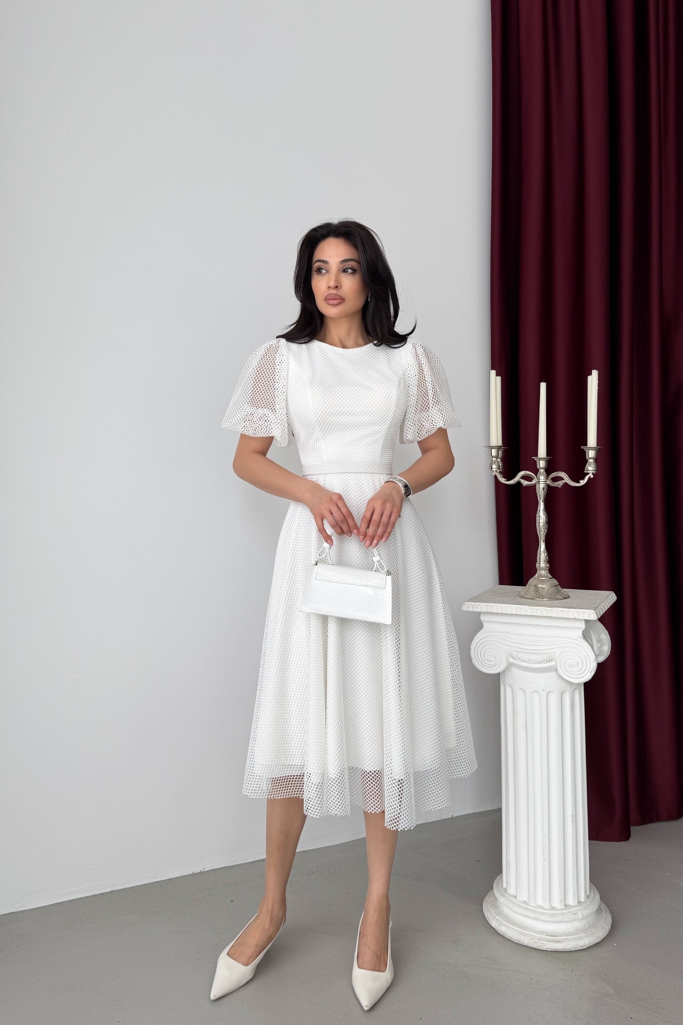 Beyaz Balon Kol File Kumaşlı Midi Abiye Elbise