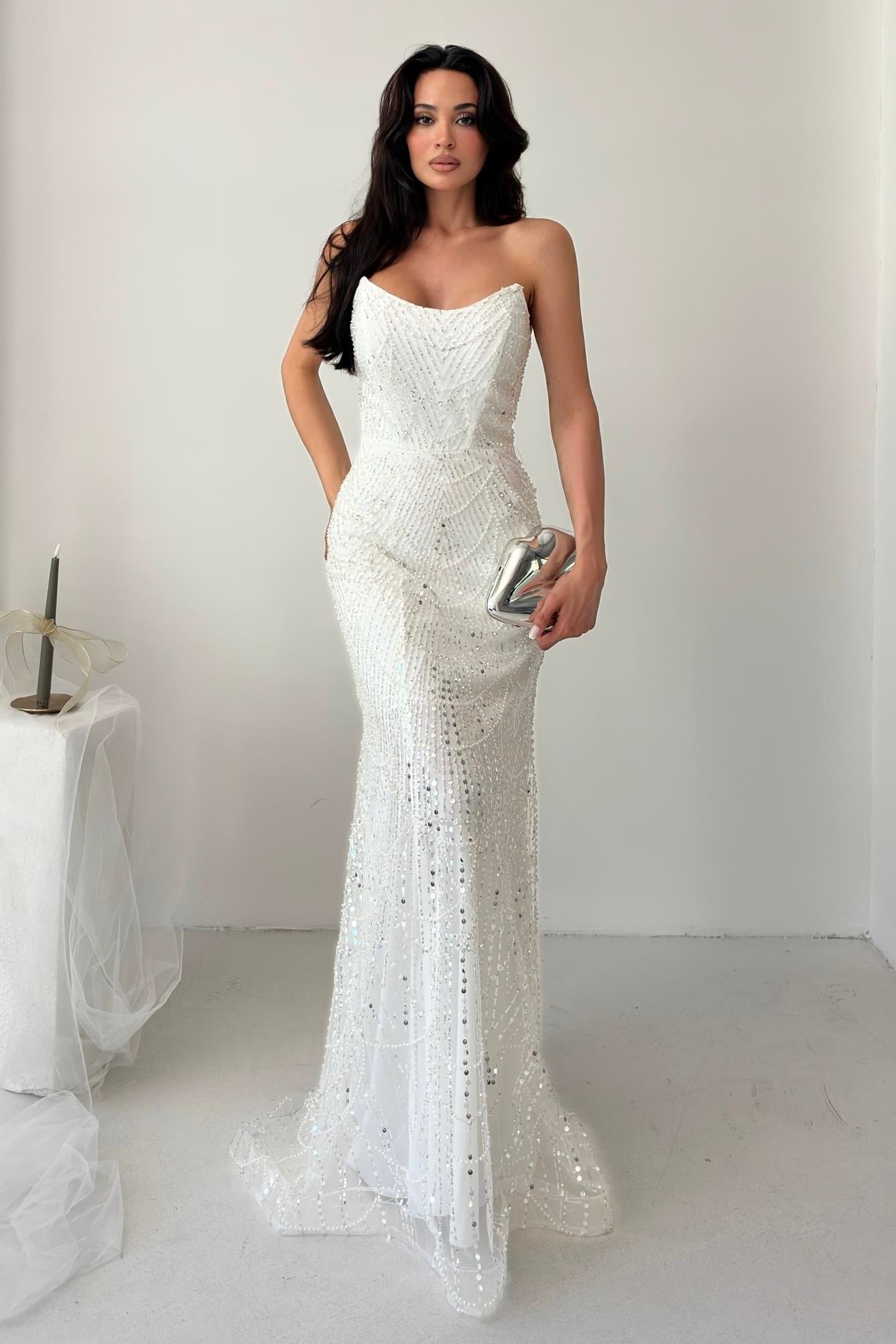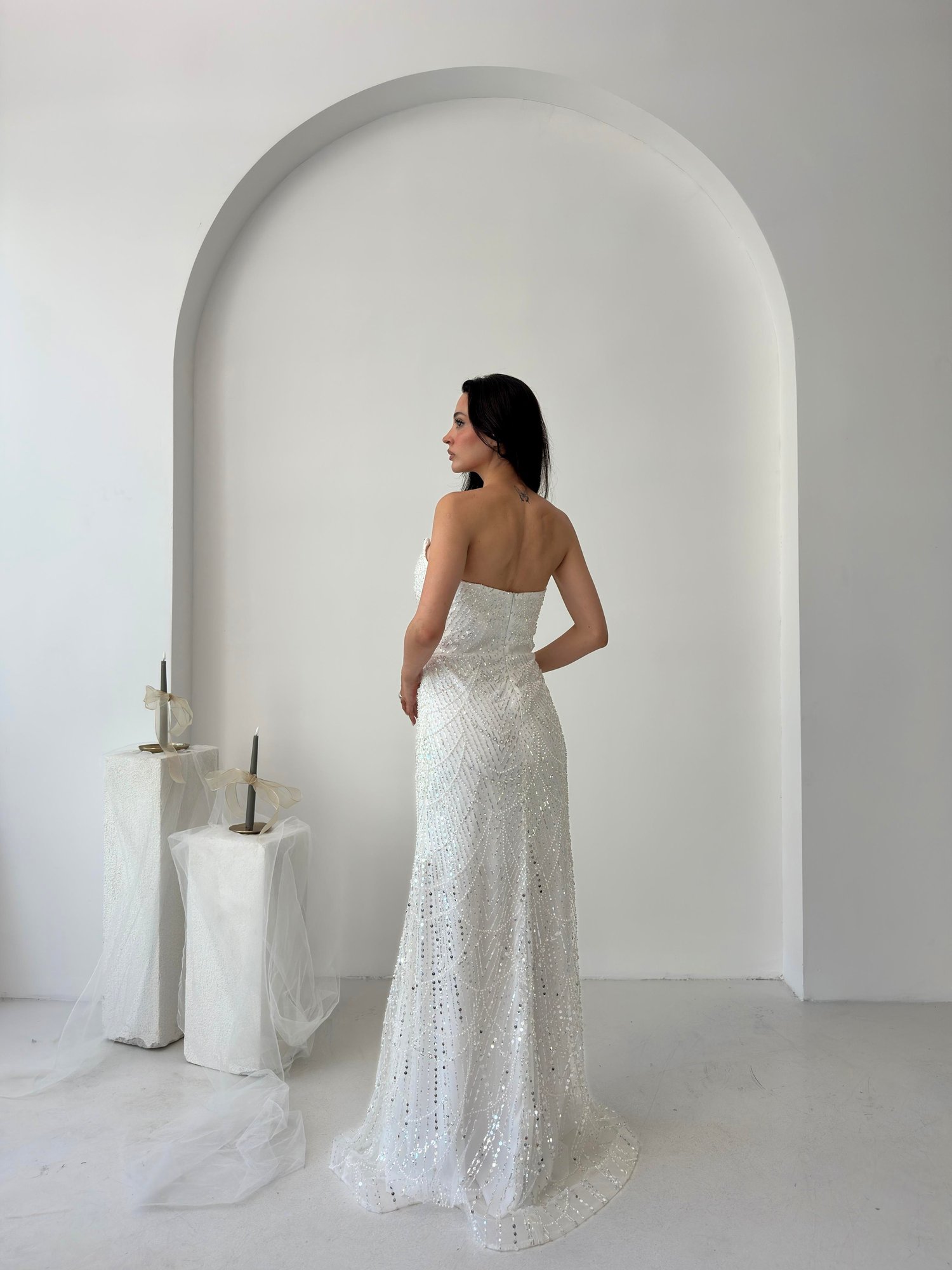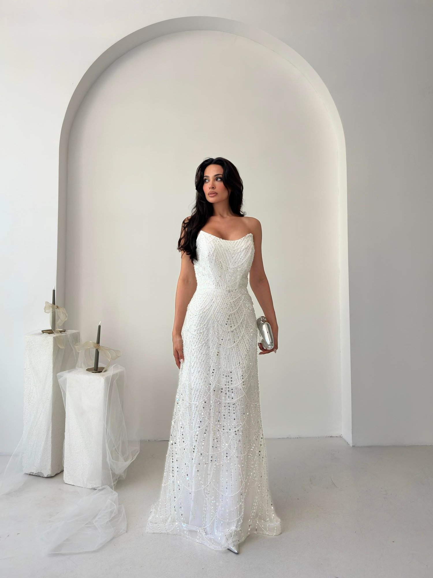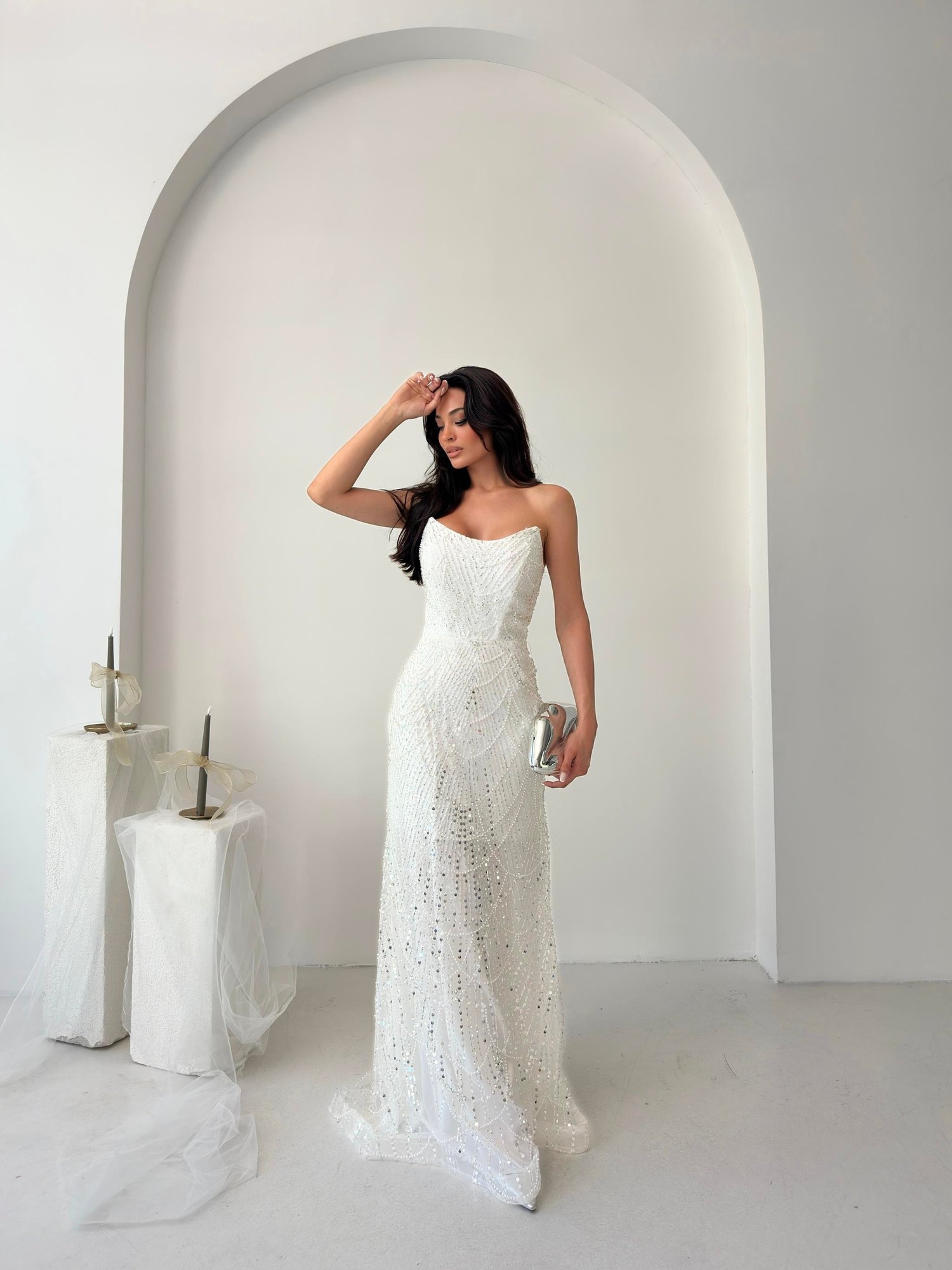 Beyaz Boncuk İşlemeli  Payetli Straplez Abiye Elbise