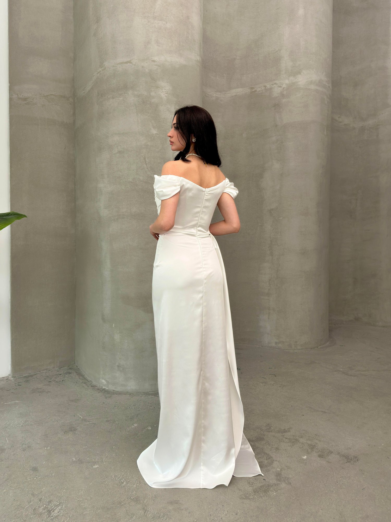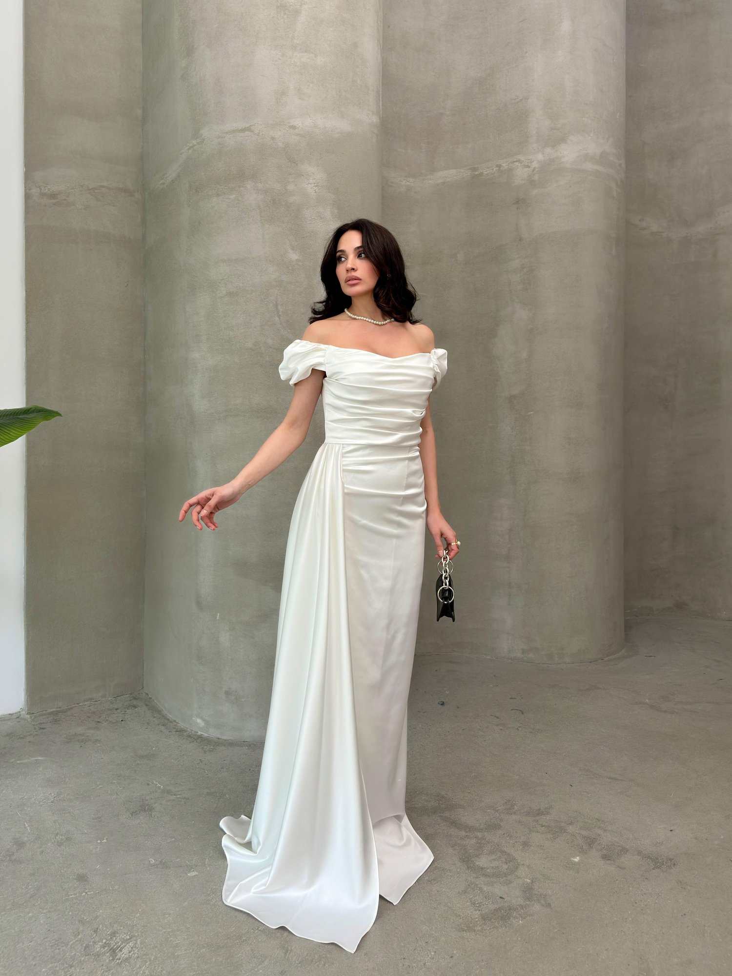 Beyaz Düşük Omuz Drapeli Abiye Elbise