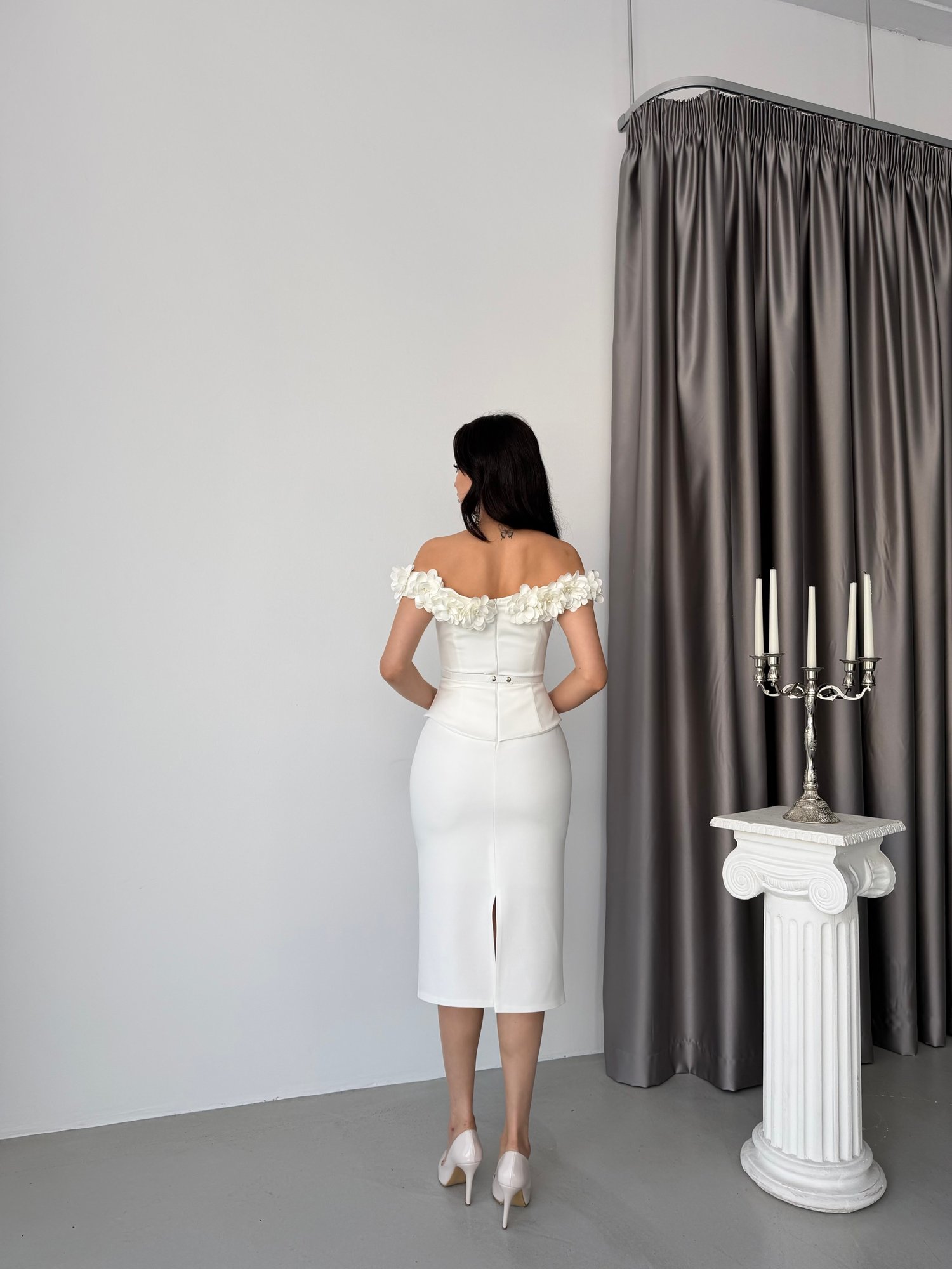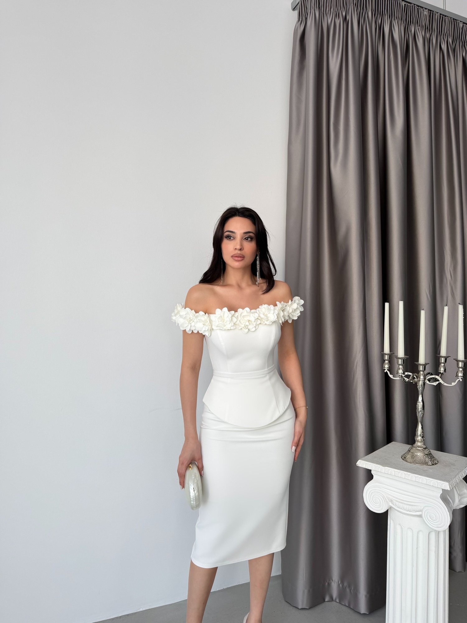 Romantik ve zarif detaylarıyla öne çıkan bu midi boy abiye elbise, feminen silueti modern bir dokunuşla buluşturur. Düşük omuz (off-shoulder) yaka formu, üç boyutlu çiçek aplikeleriyle hareketlendirilerek tasarıma sofistike bir hava katar. Vücudu saran üst form ve bel kısmındaki peplum detayı, ince bir bel görünümü oluştururken kalem etek kesimi hatları kusursuz şekilde vurgular. Minimal ama etkileyici duruşuyla özel davetlerin şık parçalarından biridir.