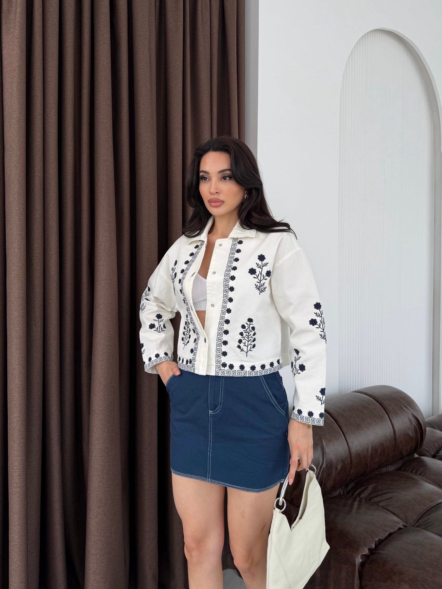 Modern bohem dokunuşlarla tasarlanan bu kısa ceket, stilinize karakter kazandıran güçlü bir parça. Açık renk zemin üzerine işlenen kontrast nakış detayları, ürüne özgün ve dikkat çekici bir görünüm sunar. Hafif crop kesimi sayesinde bel hattını vurgularken, rahat kalıbı günlük kullanımda konfor sağlar. Gömlek yaka ve düğme kapama detayı ile hem açık hem kapalı kullanım alternatifleri sunar.