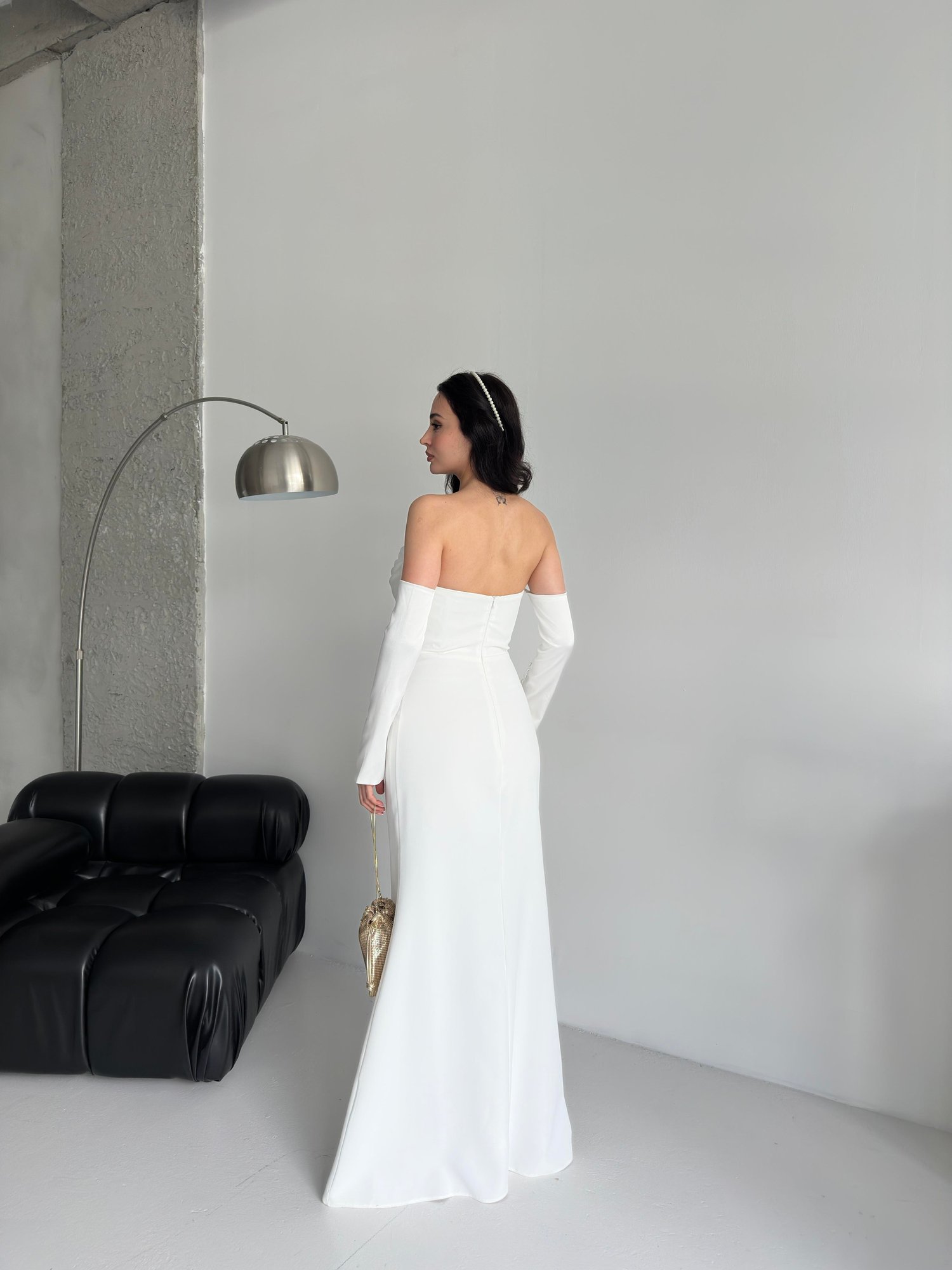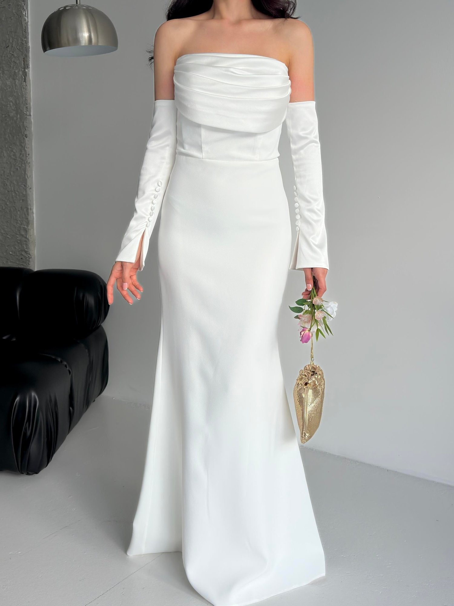 Beyaz Saten Kol Detaylı Abiye Elbise