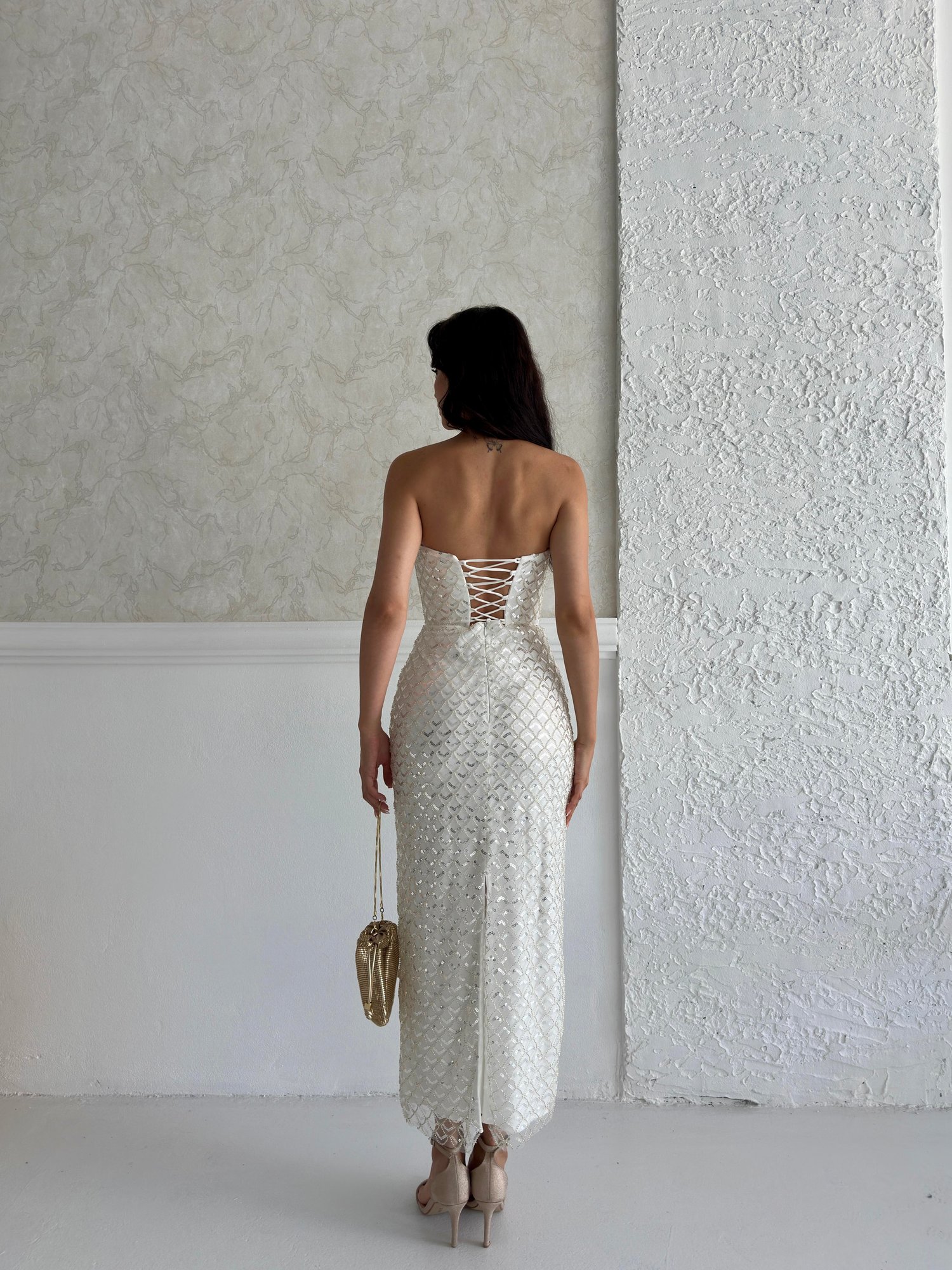 Beyaz Straplez Boncuk İşlemeli Mdii Abiye Elbise