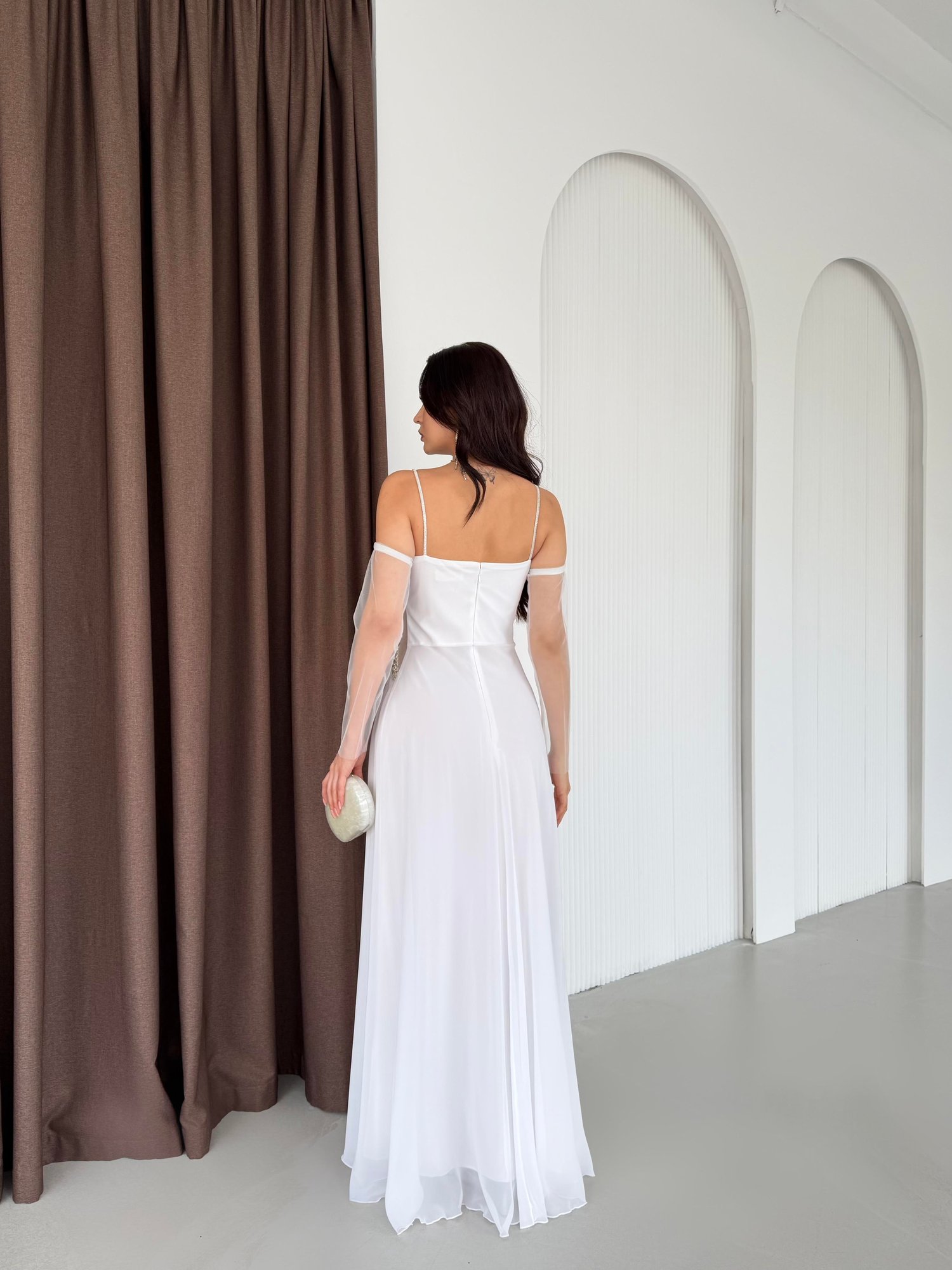 Beyaz Taş İşlemeli Tül Kollu Bel Detaylı Abiye Elbise