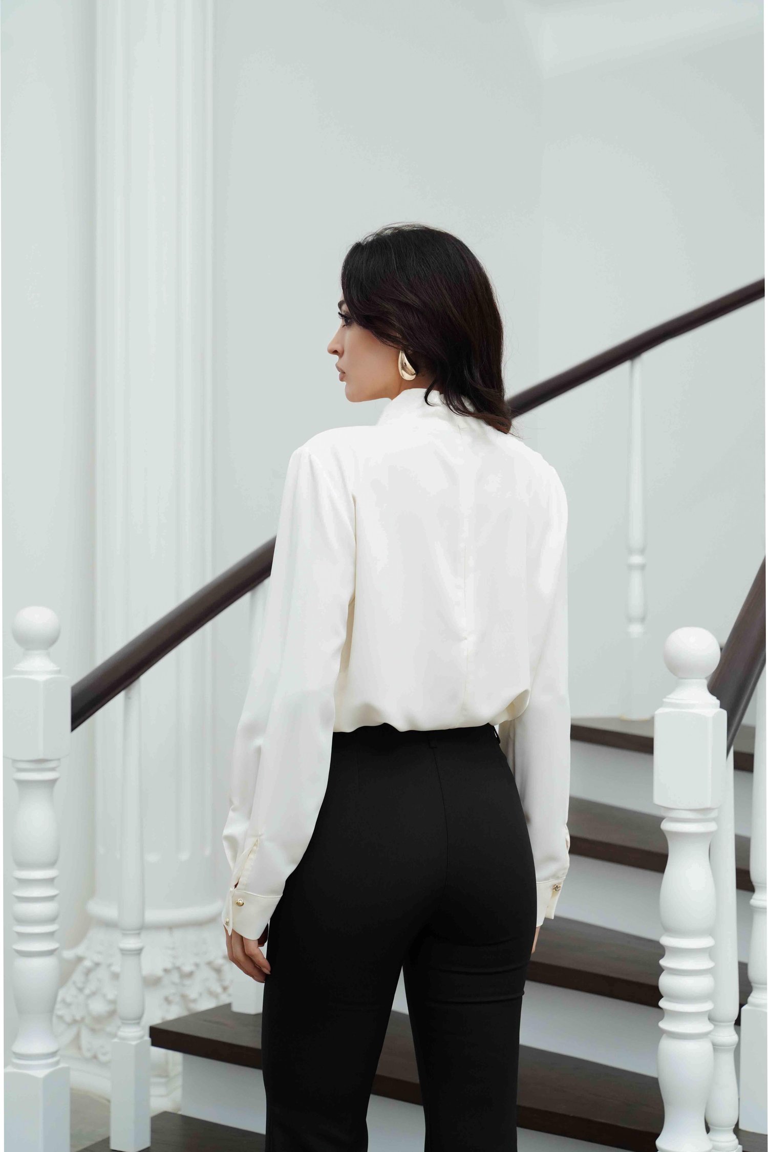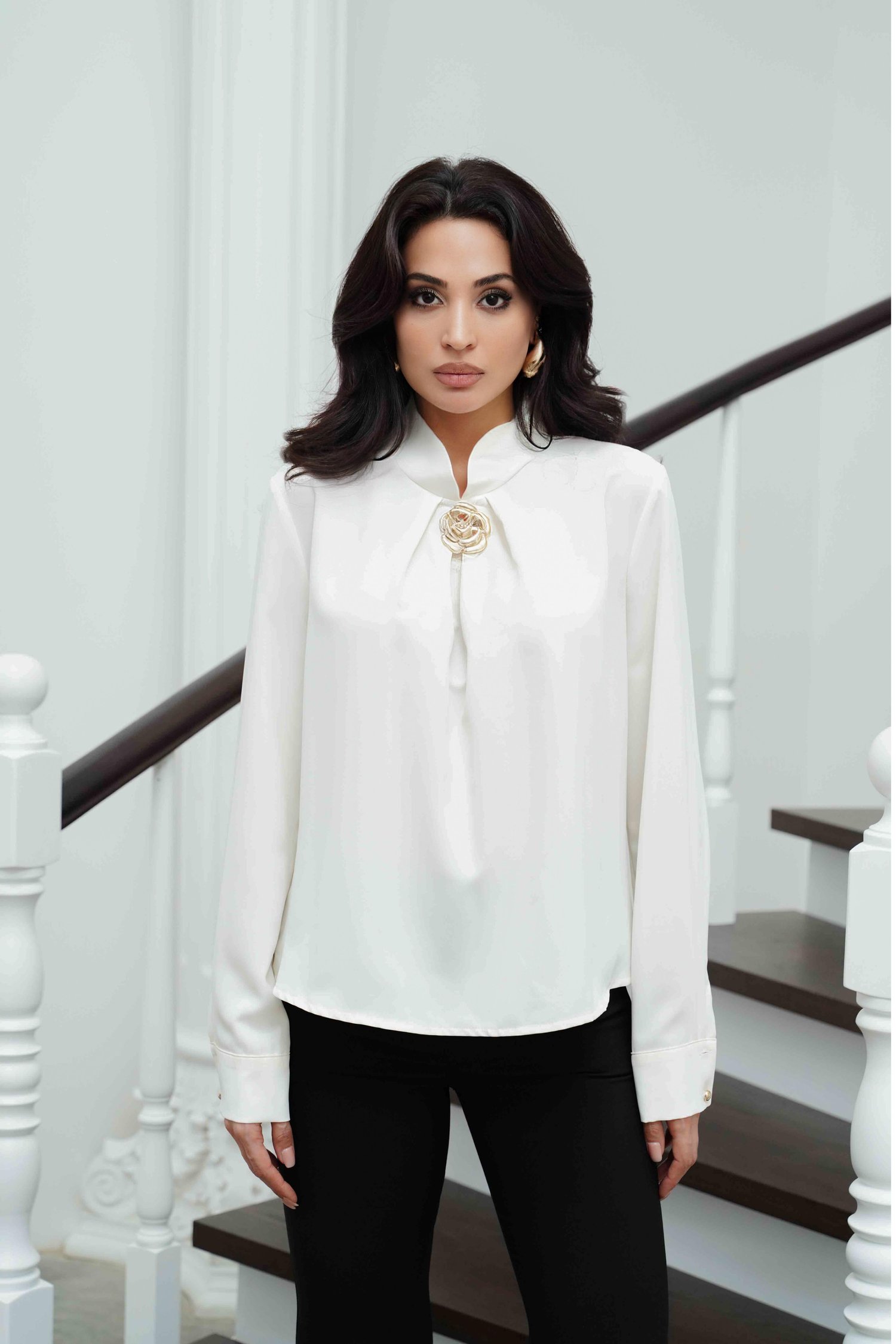 Beyaz Toka Detaylı Yüksek Yaka Saten Bluz