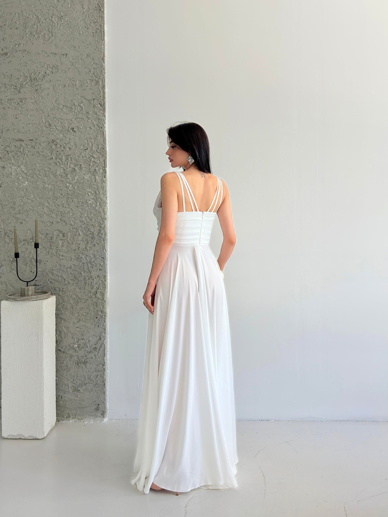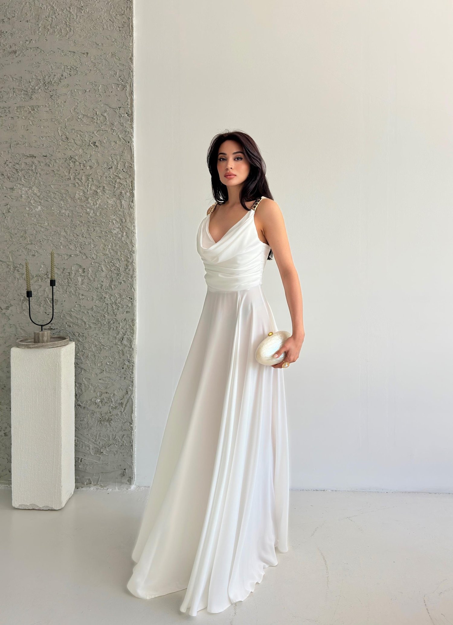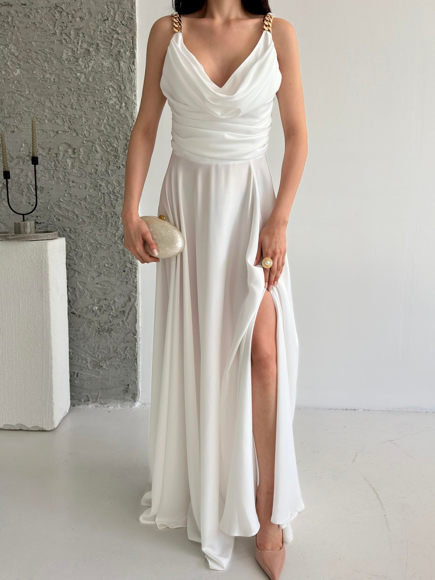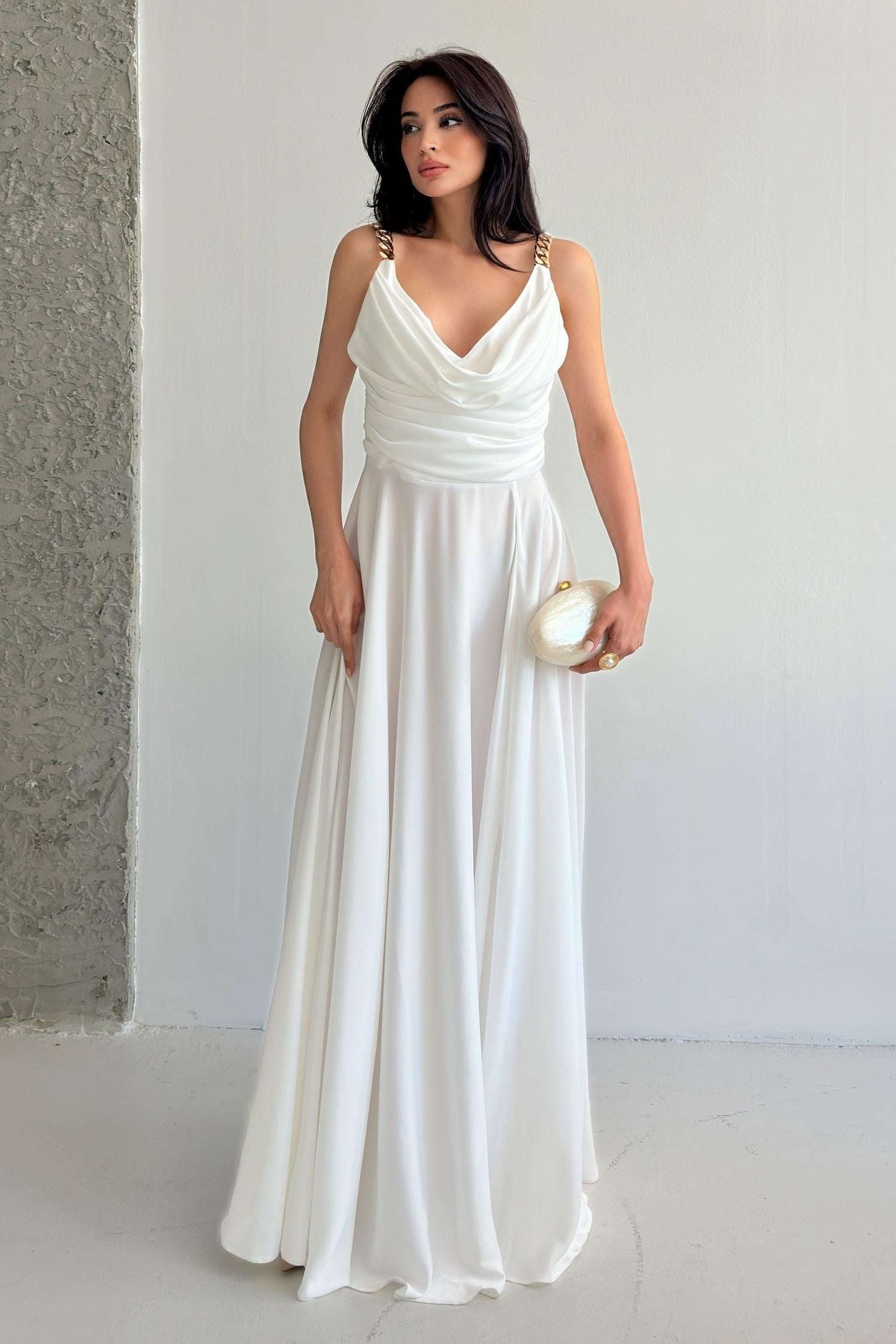 Beyaz Zincir Askılı Göğüs Drapeli Abiye Elbise