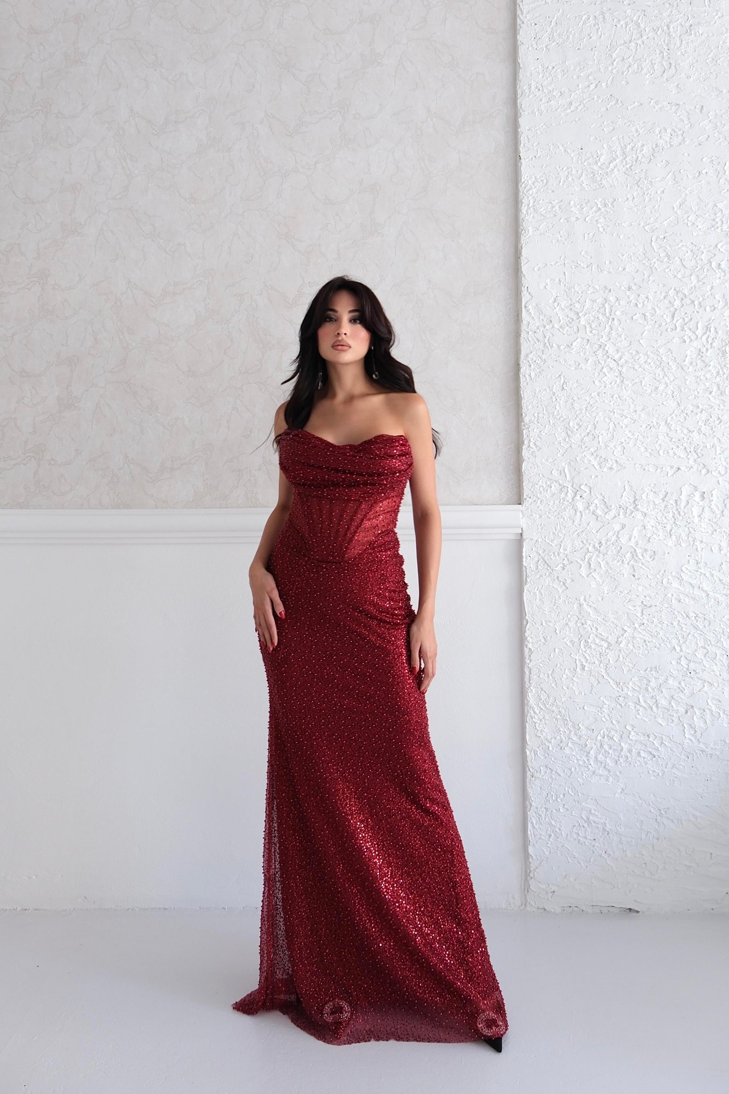 Bordo Boncuk İşlemeli Straplez Transparan Detaylı Balık Abiye Elbise