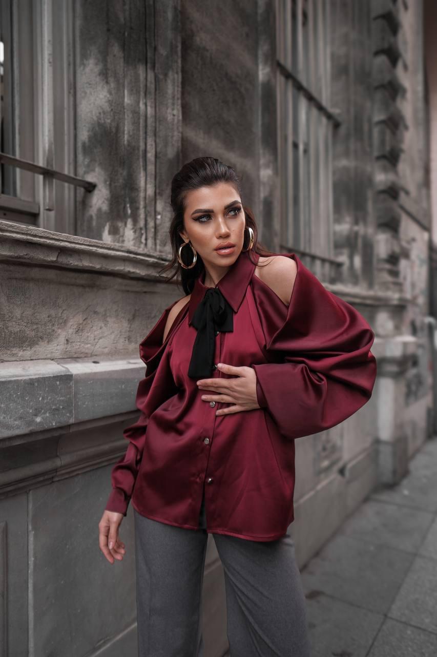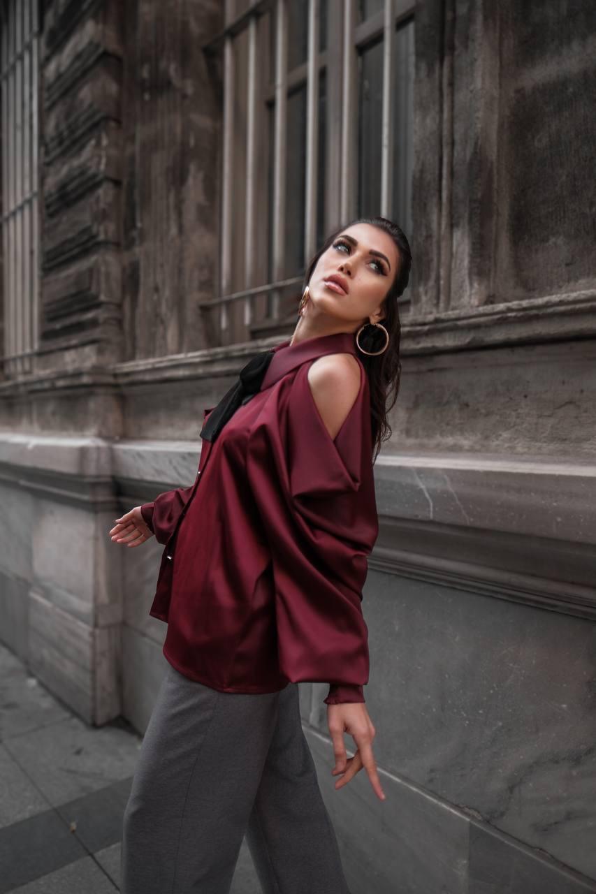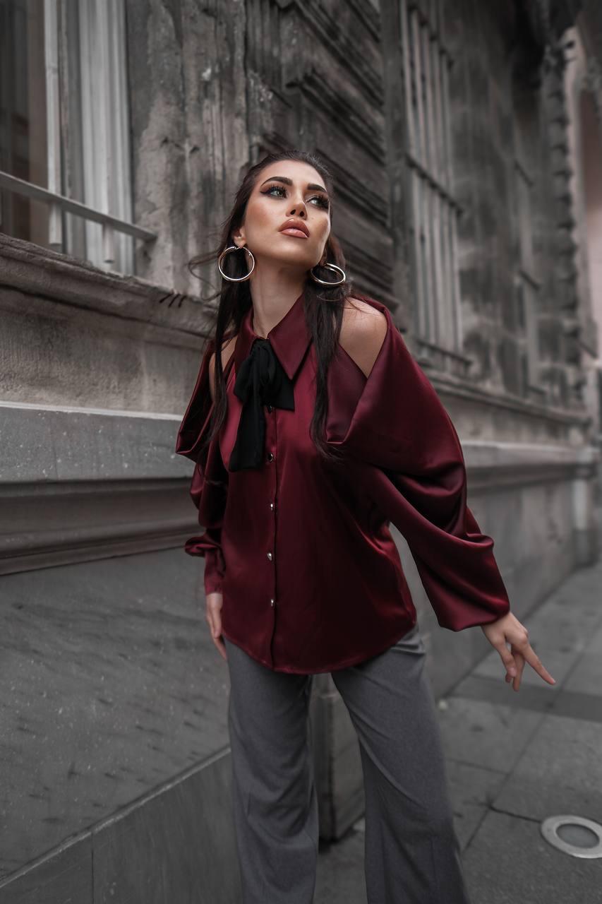 Bordo Omuz Detaylı Saten Gömlek