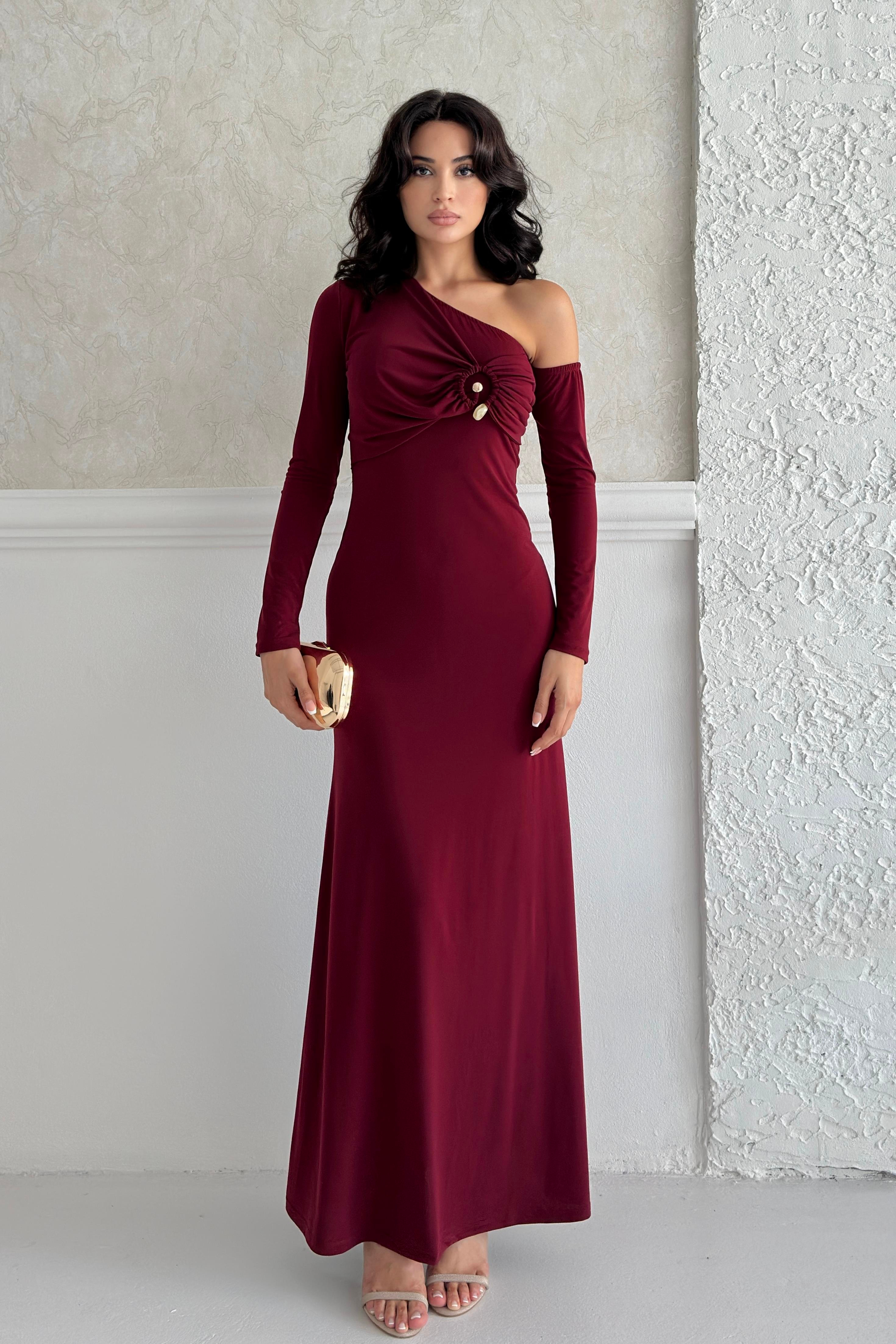 Bordo Taş Aksesuarlı Düşük Omuz Uzun Elbise