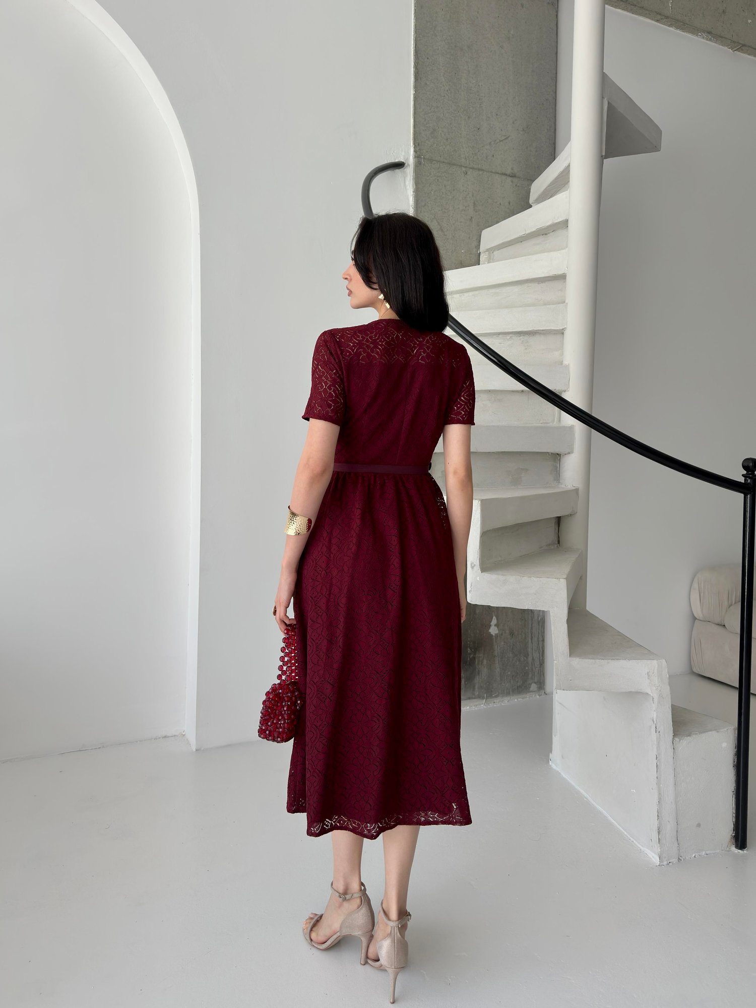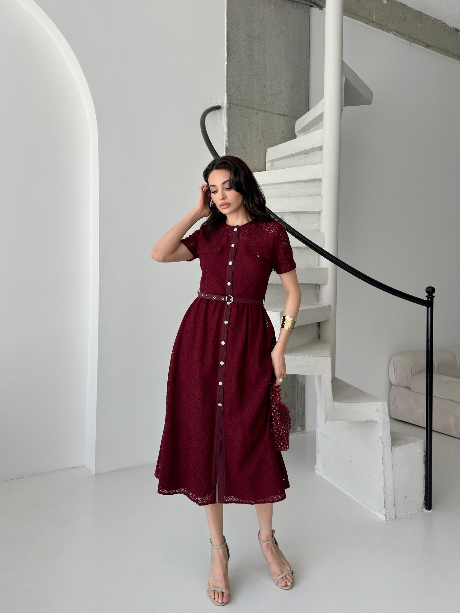 Bordo Taş Düğmeli Kemerli Midi Dantel Elbise