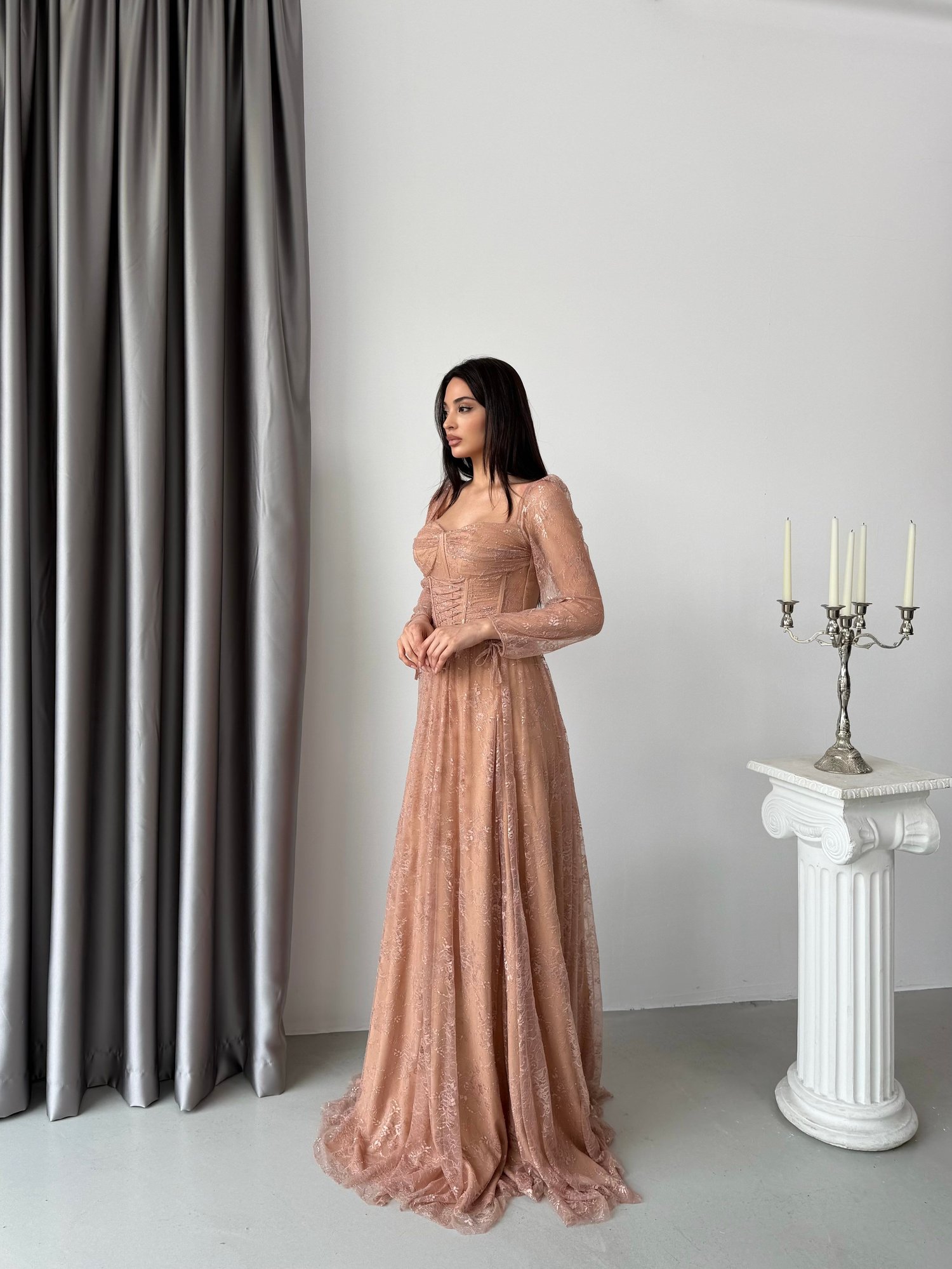 Romantik ve zarif tasarımıyla öne çıkan bu abiye elbise, feminen detaylarıyla dikkat çekici bir siluet sunar. Kalp yaka formundaki korse detaylı üst tasarım göğüs ve bel hattını zarif şekilde vurgularken, bel kısmındaki bağcıklı korse formu vücuda kusursuz bir uyum sağlar. Transparan dantel uzun kollar elbiseye romantik ve sofistike bir görünüm kazandırır. Akıcı ve dökümlü etek formu ile yan yırtmaç detayı hareketli ve iddialı bir stil oluşturur. Özel davetlerde zarif ve etkileyici bir görünüm sunar.