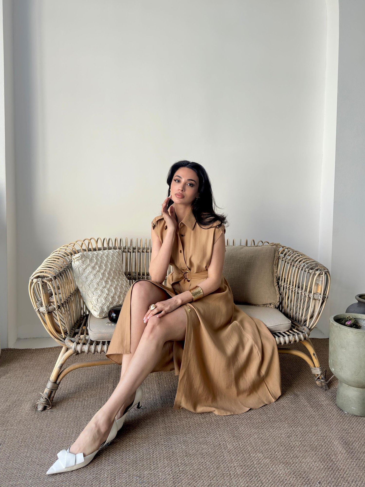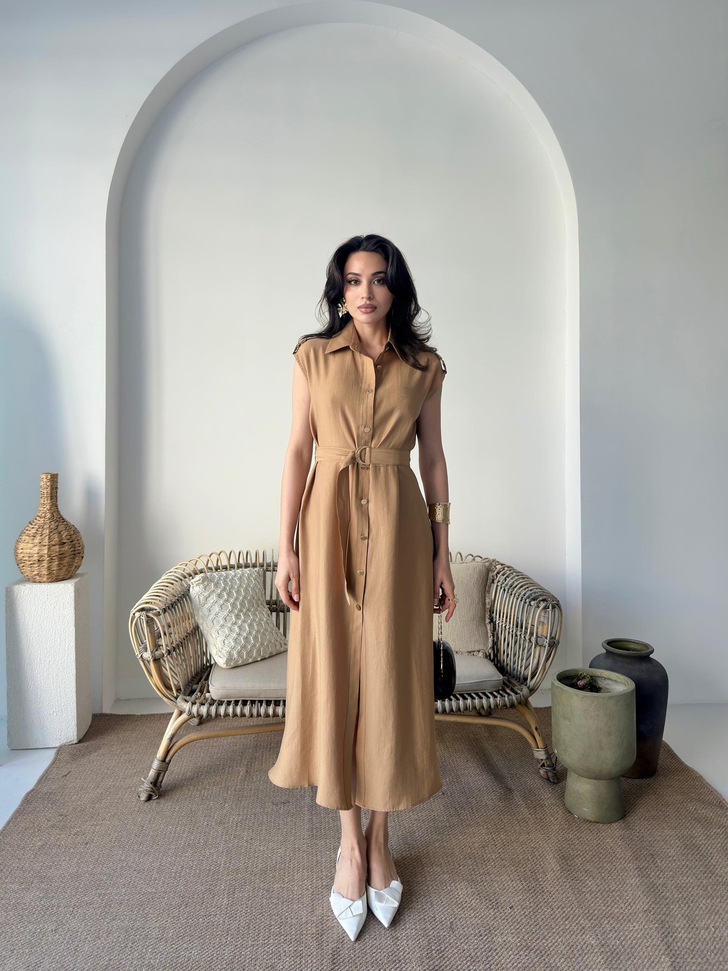 Camel Kemer Detaylı Gömlek Yaka Midi Elbise