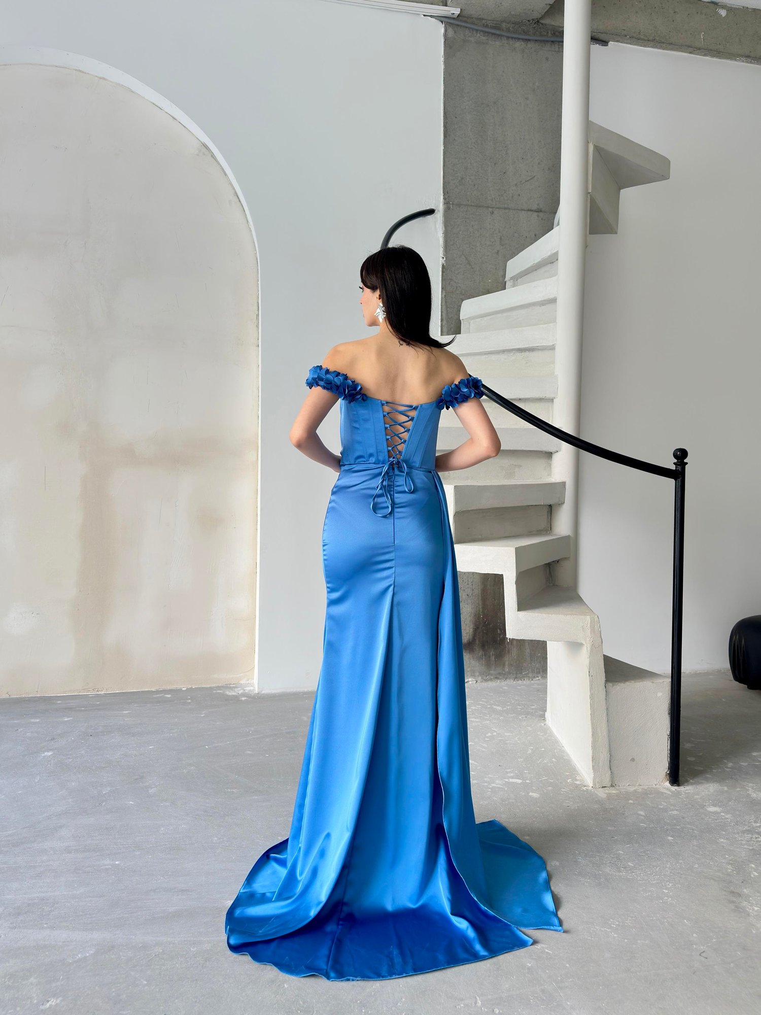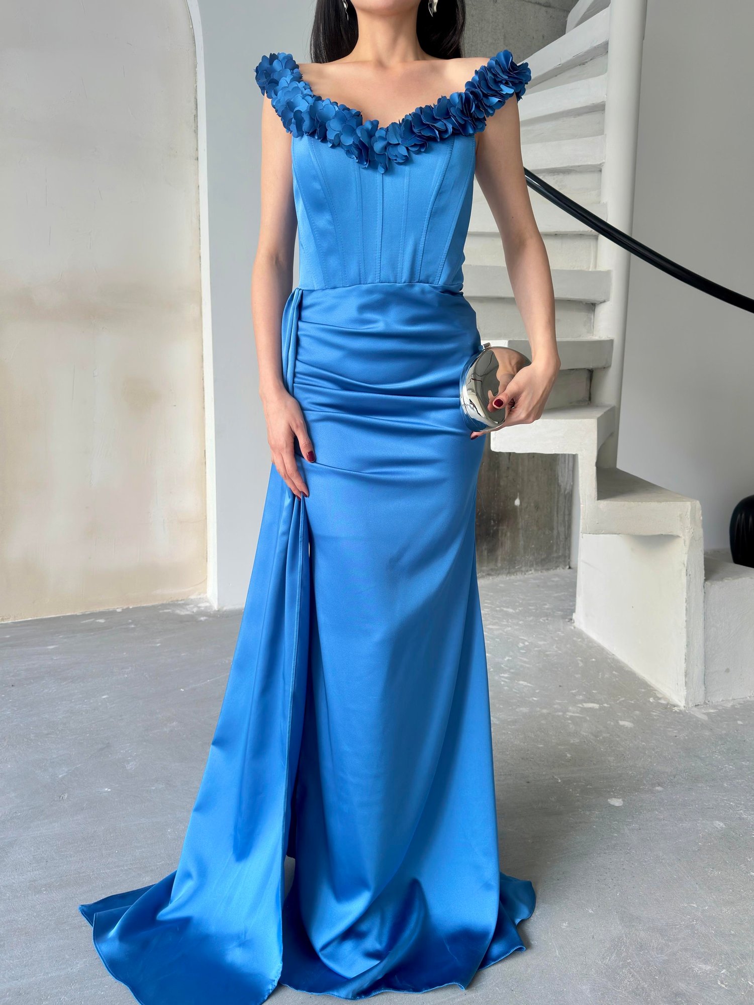 Çiçek Detaylı Önü Büzgülü Uzun Saten Elbise