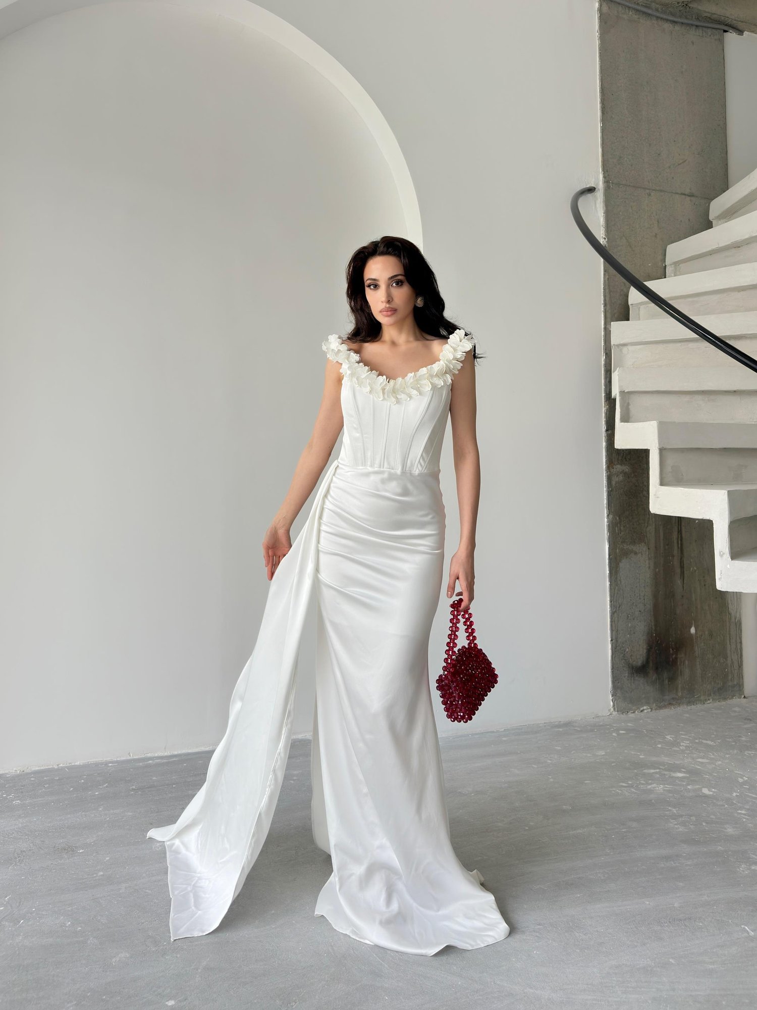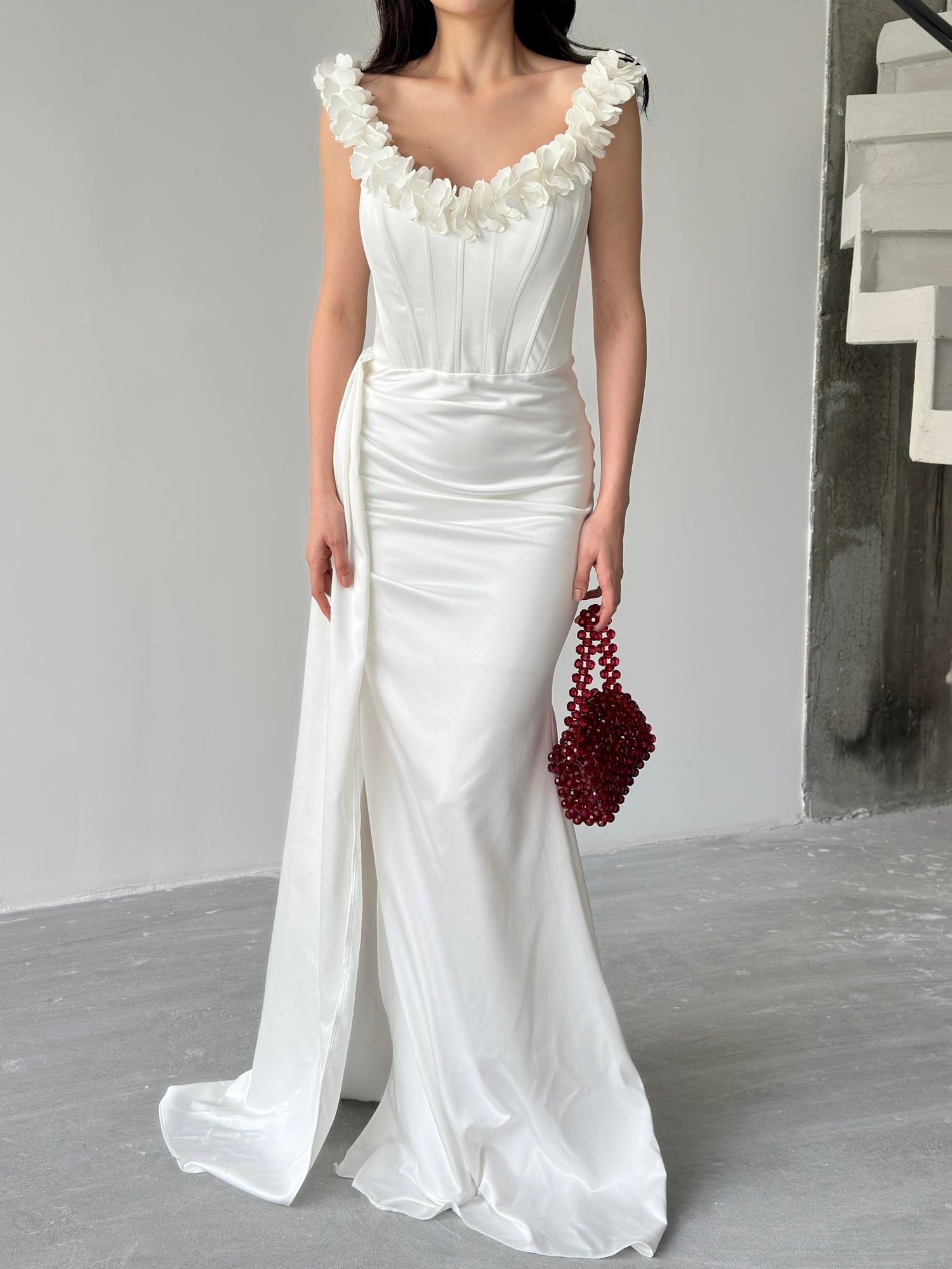 Çiçek Detaylı Önü Büzgülü Uzun Saten Elbise