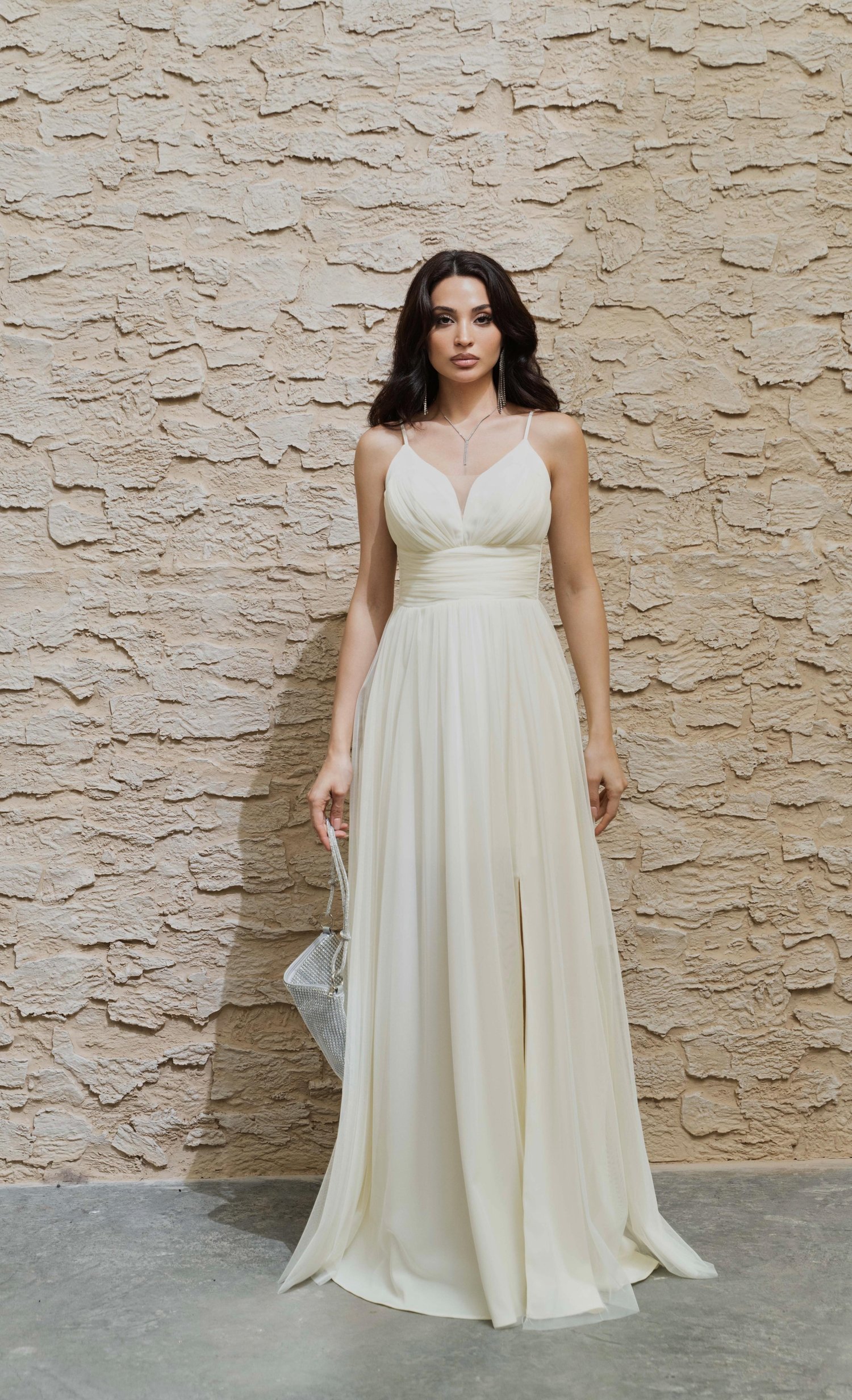 Ekru İp Askılı Yırtmaçlı Tül Abiye Elbise