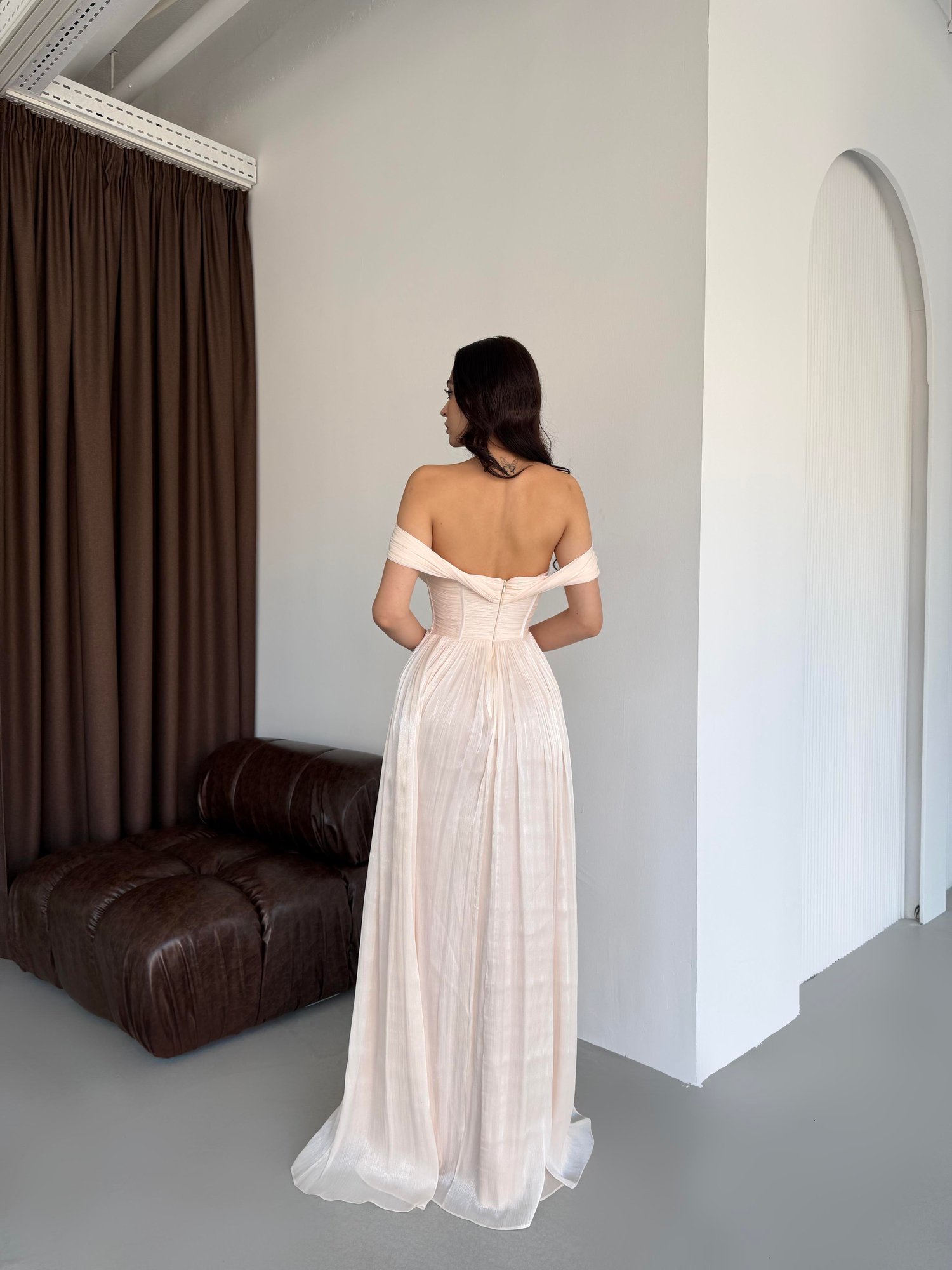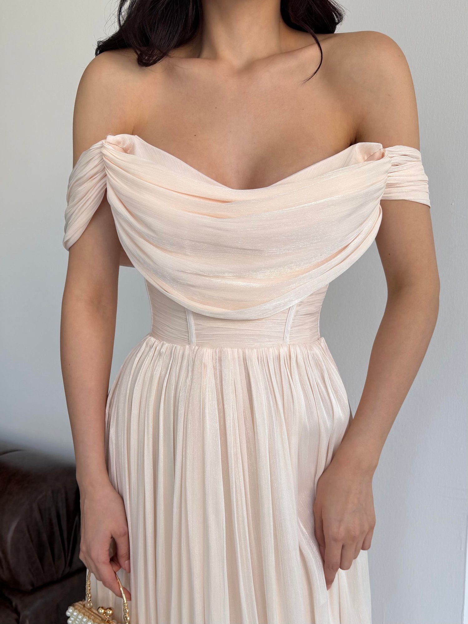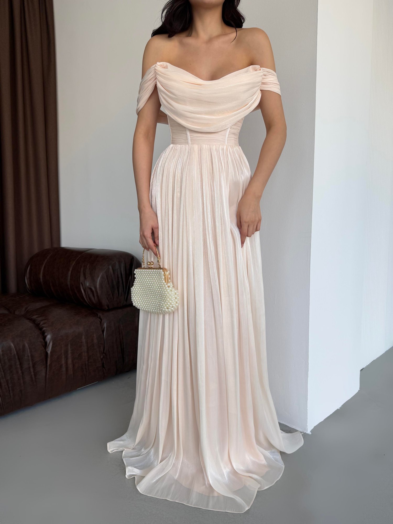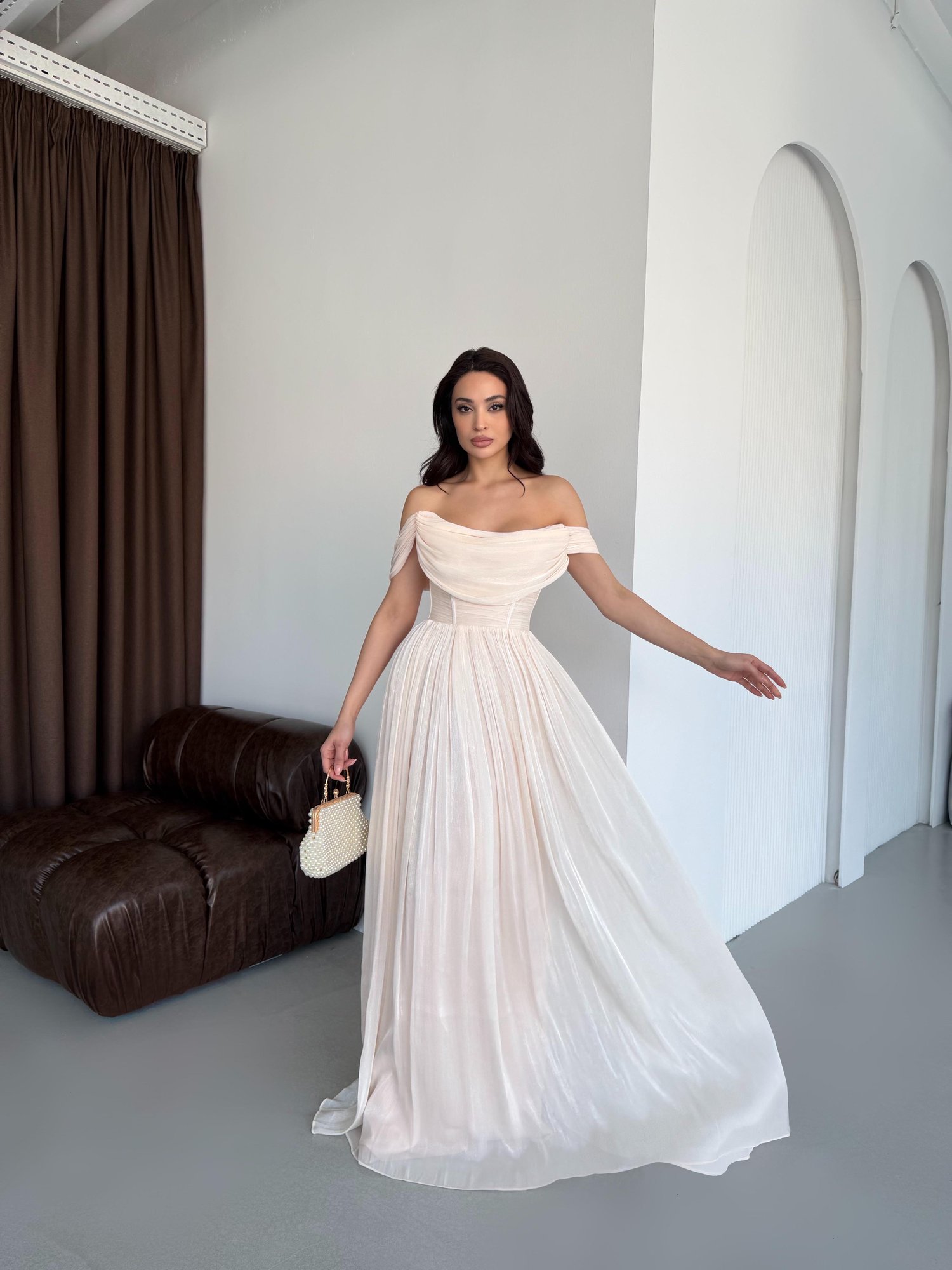 Ekru Kayık Yaka Pliseli Abiye Elbise