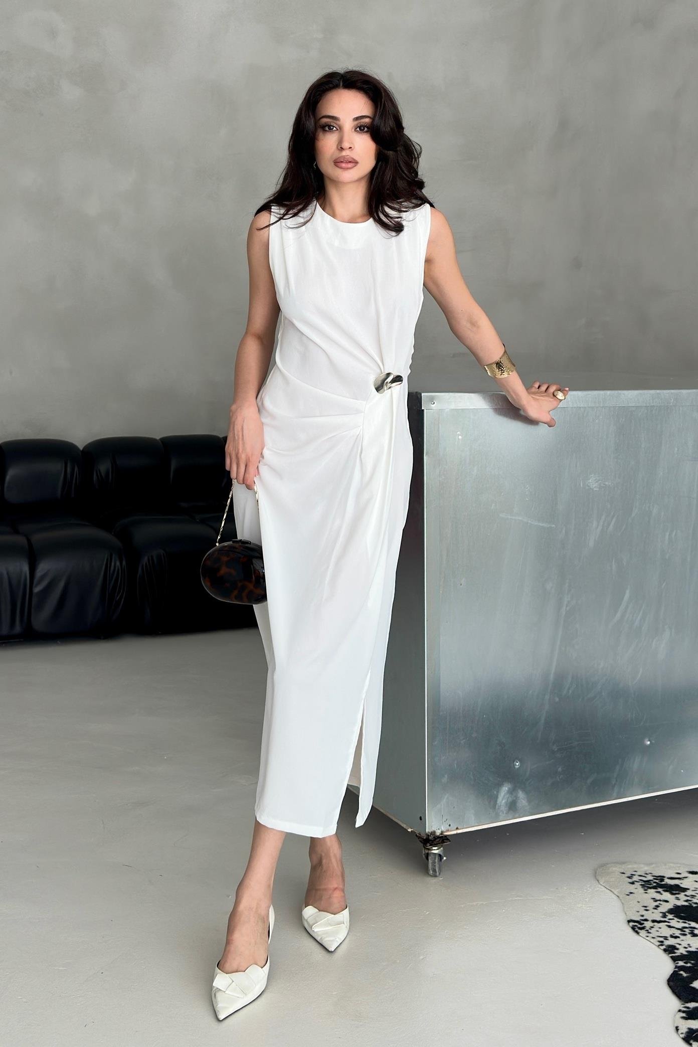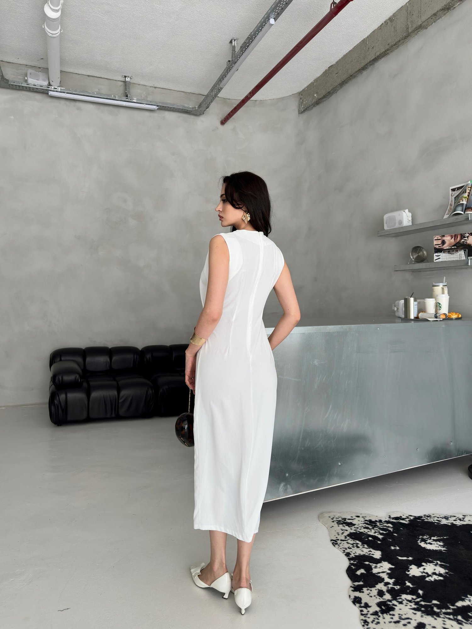 Ekru Tokalı Pile Detaylı Kolsuz Elbise