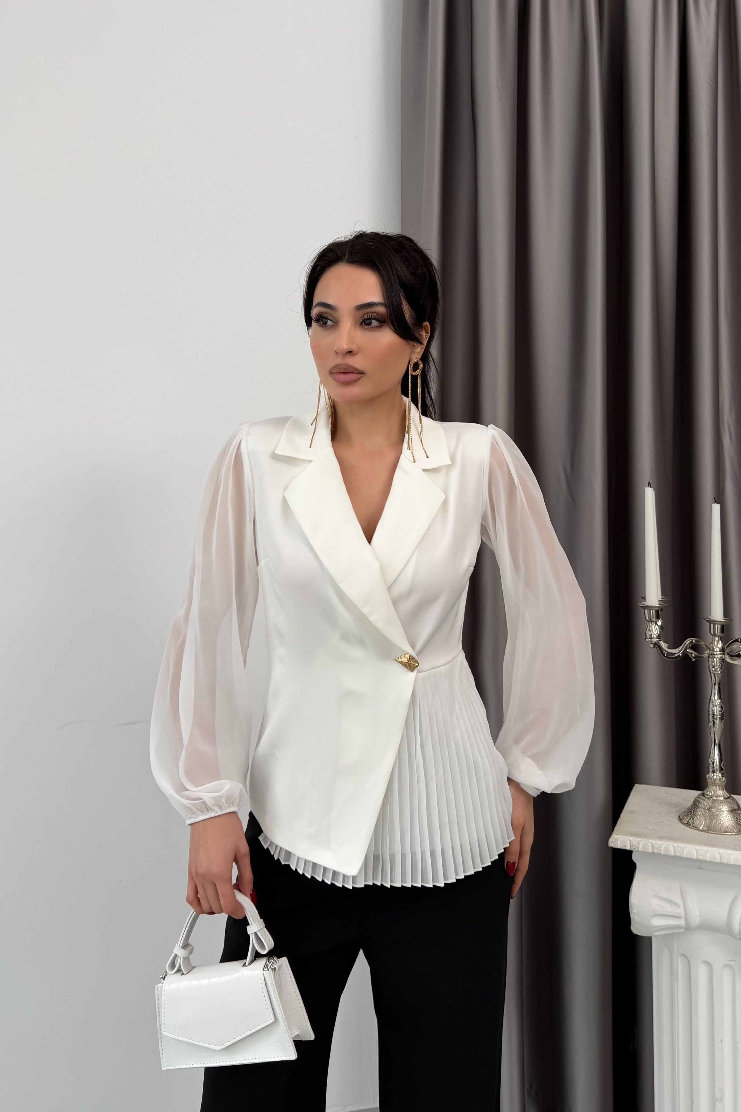 Siyah Tül Kol Pliseli Kruvaze Yaka Ceket Bluz Ekru Tül Kol Pliseli Kruvaze Yaka Ceket Bluz