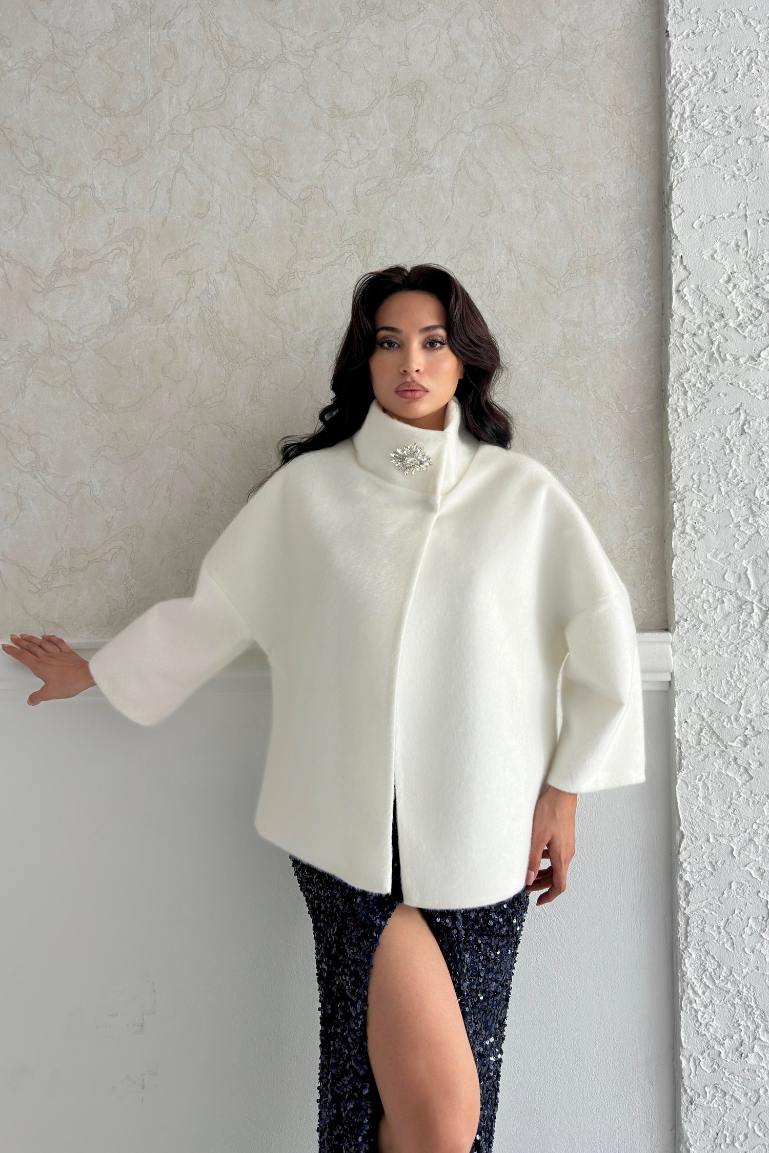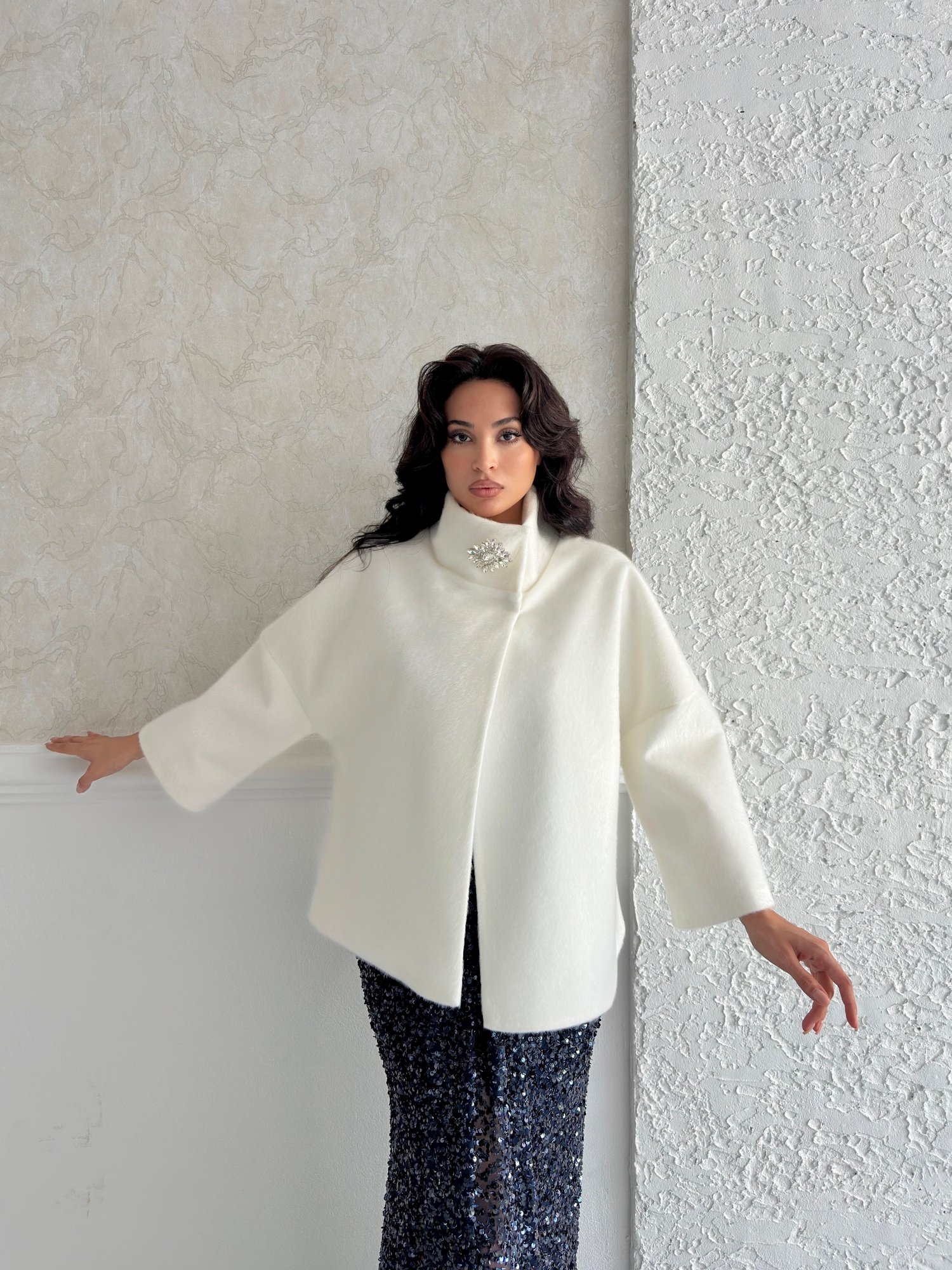Ekru Yaka Broşlu Astarlı Tay Tüyü Ceket Bolero