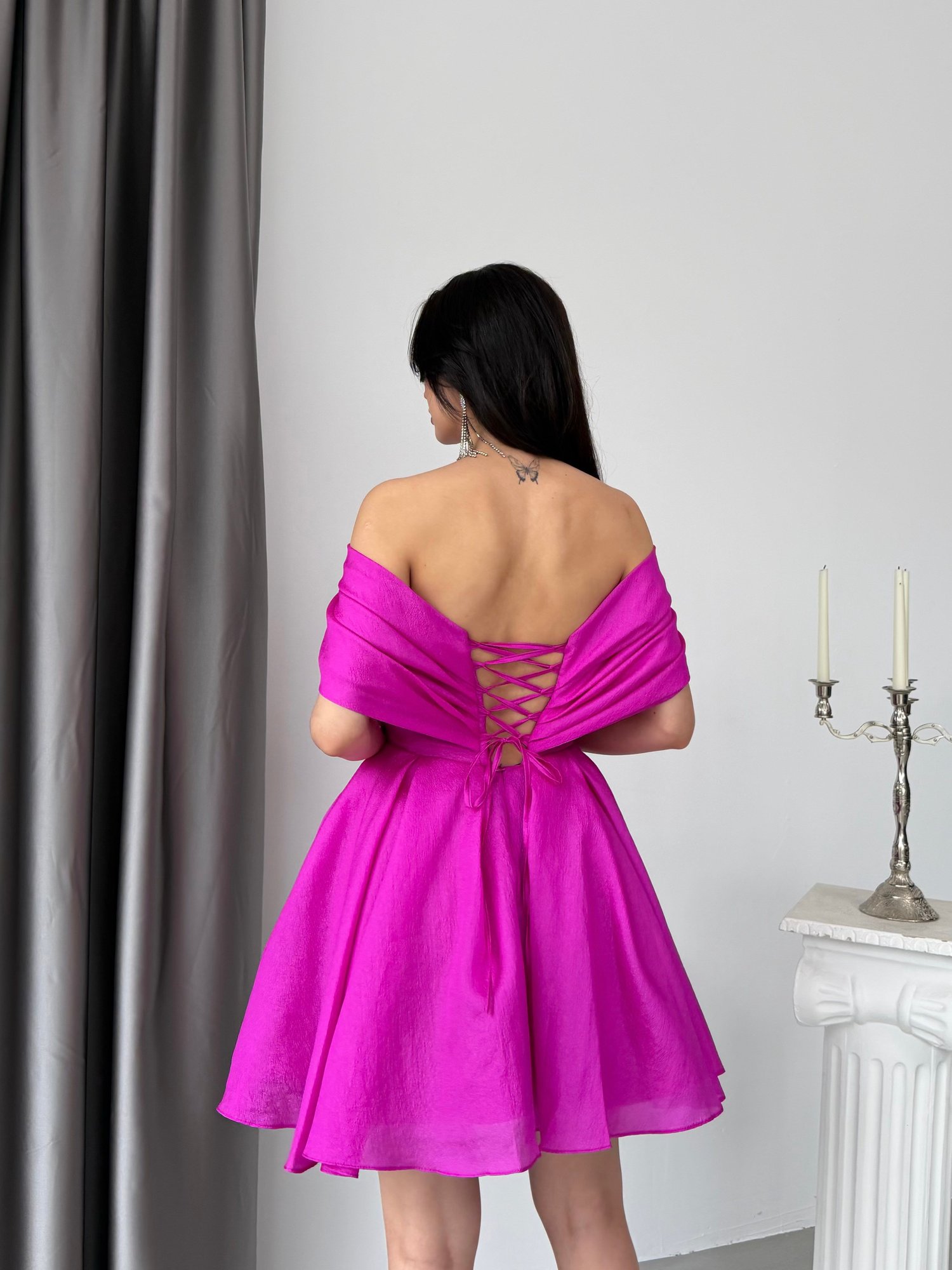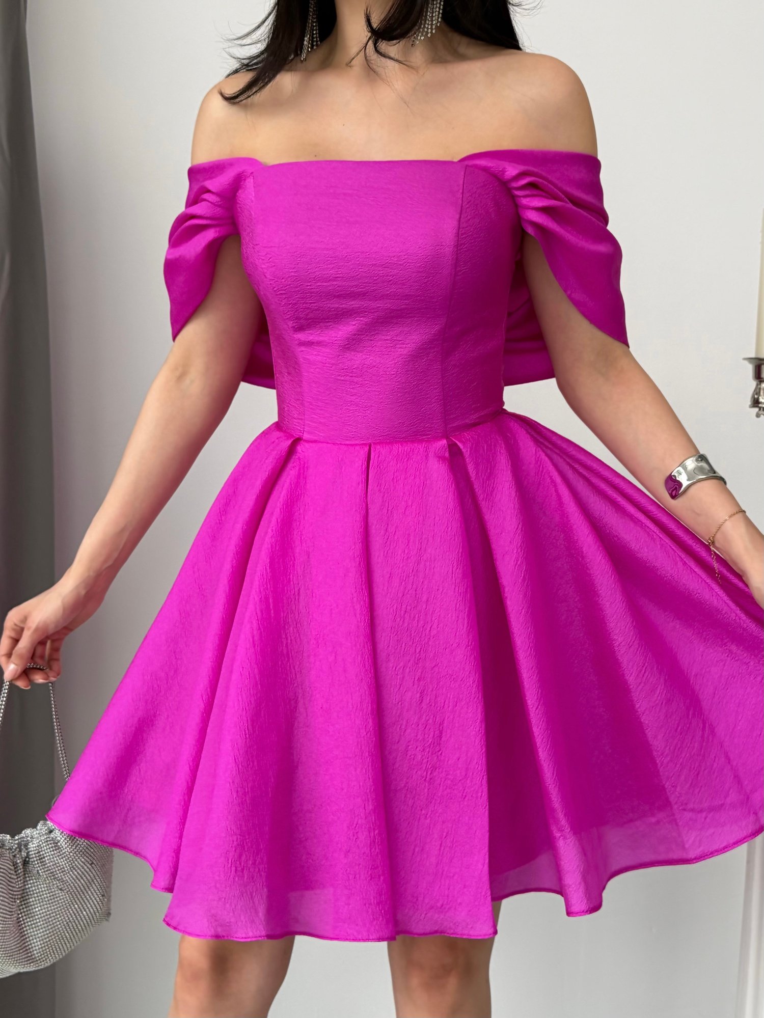 Fuşya Eteği Pileli Sırt Detaylı Abiye Elbise
