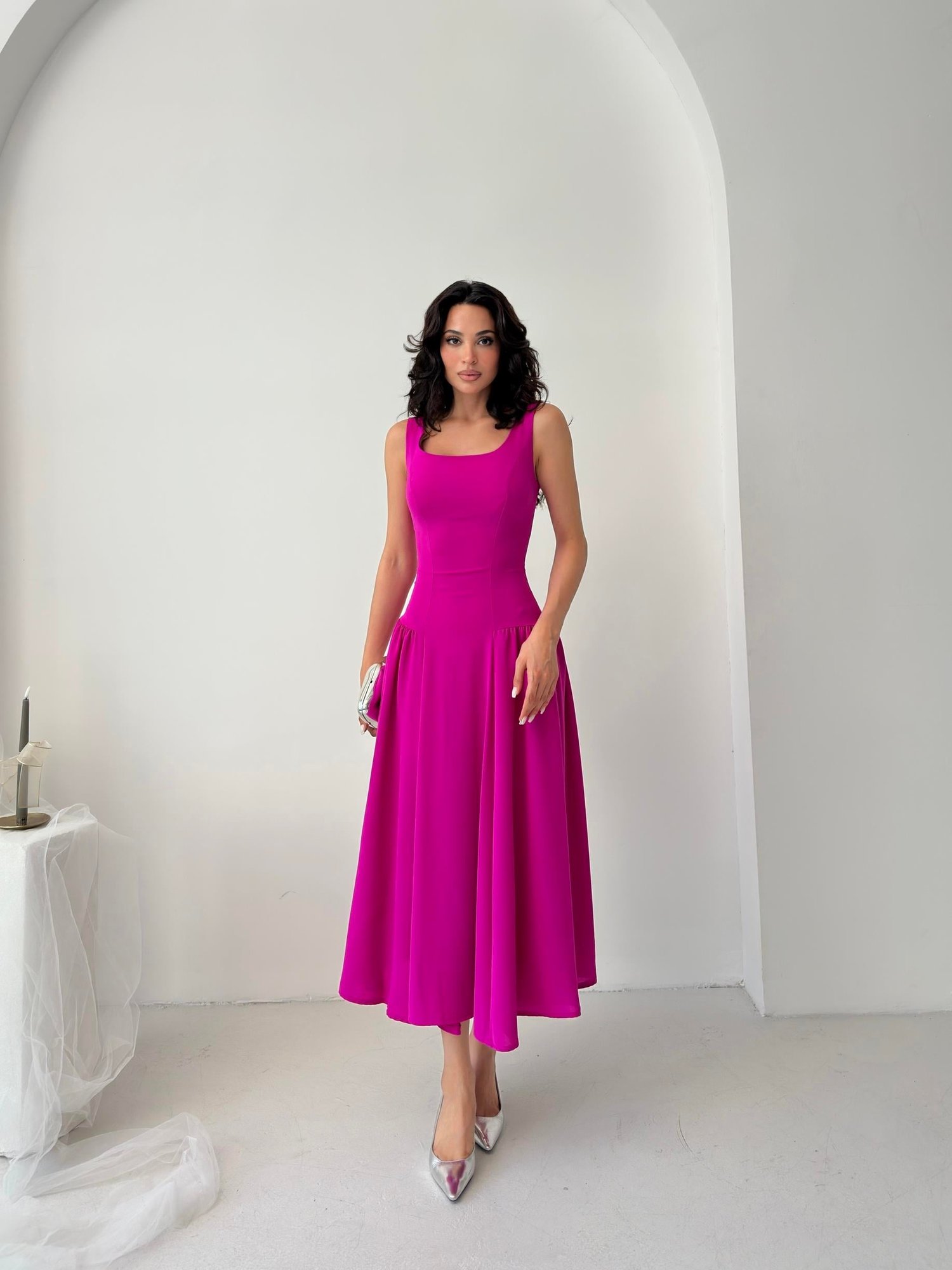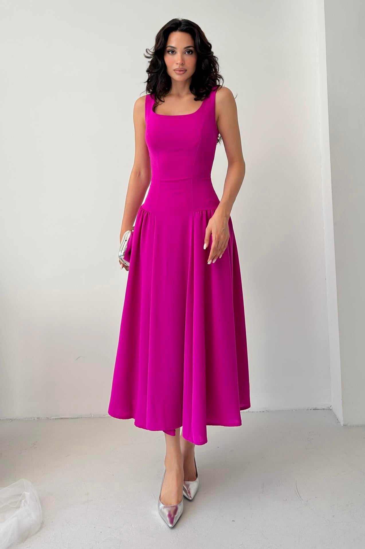 Fuşya Kare Yaka Gipeli Midi Elbise