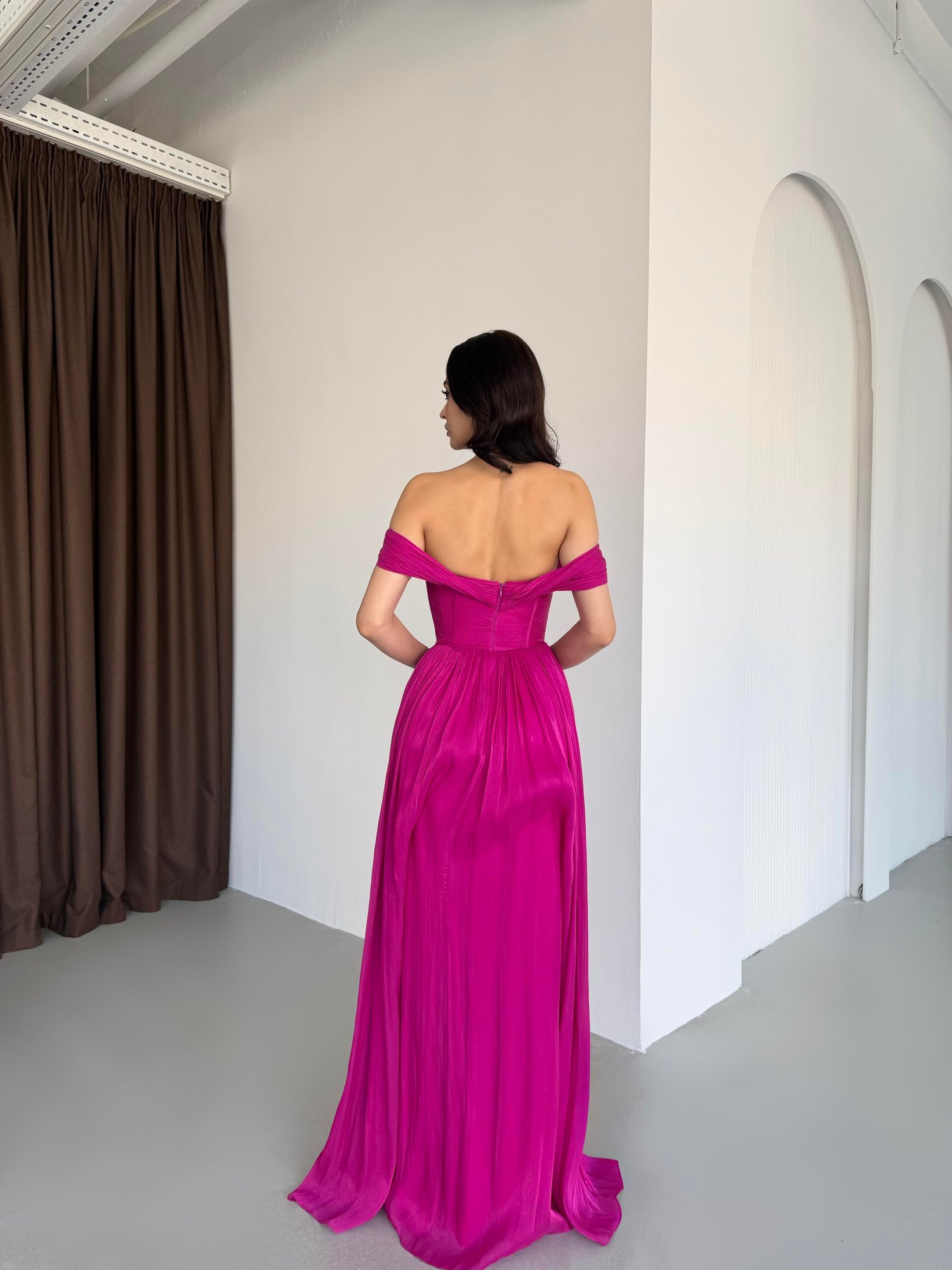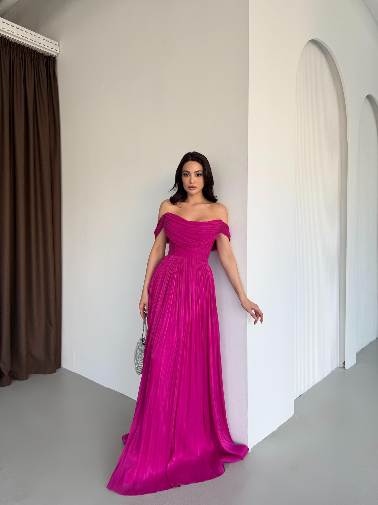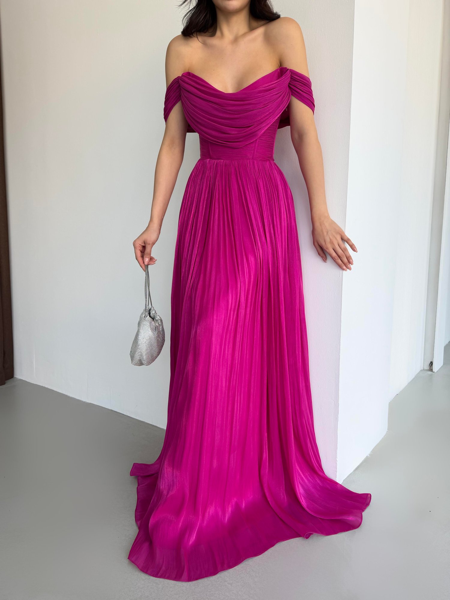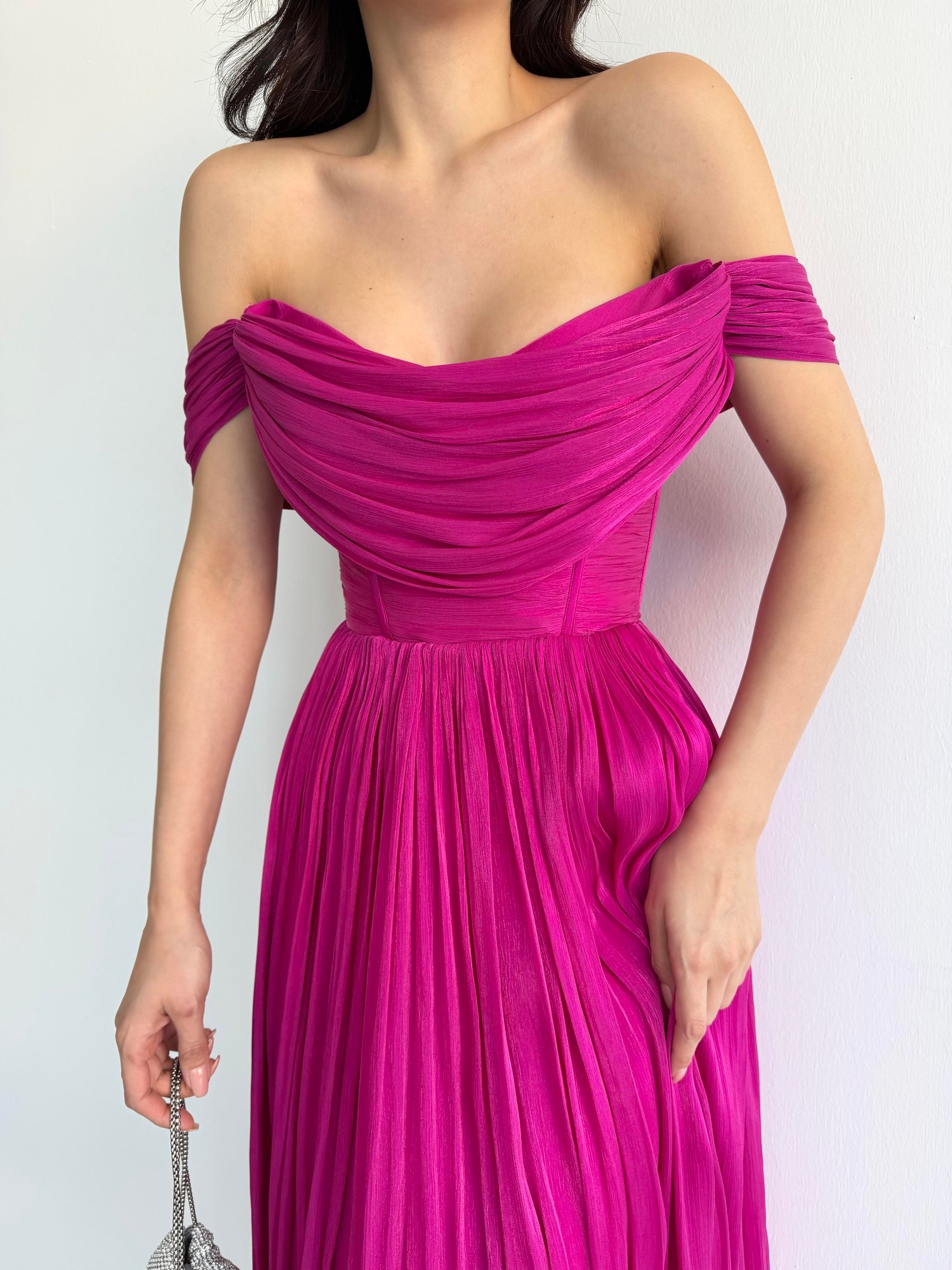 Fuşya Kayık Yaka Pliseli Abiye Elbise