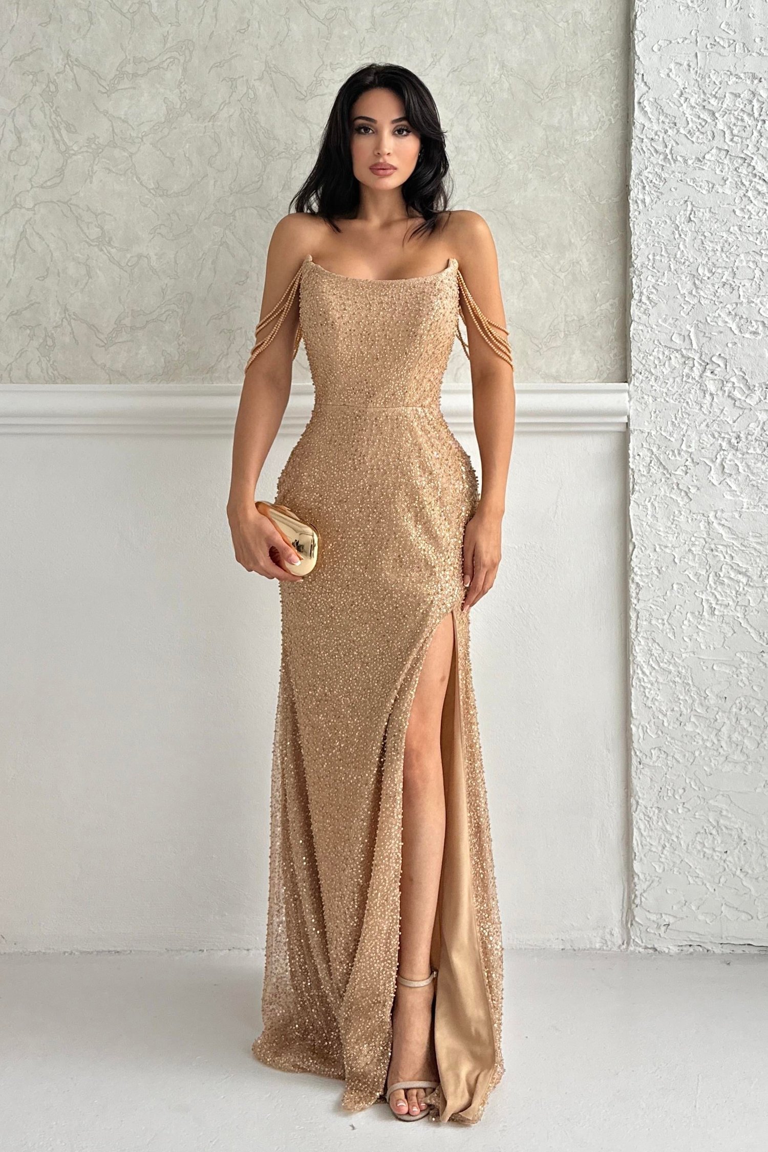 Gold Boncuk İşlemeli Kol Detaylı Straplez Abiye Elbise