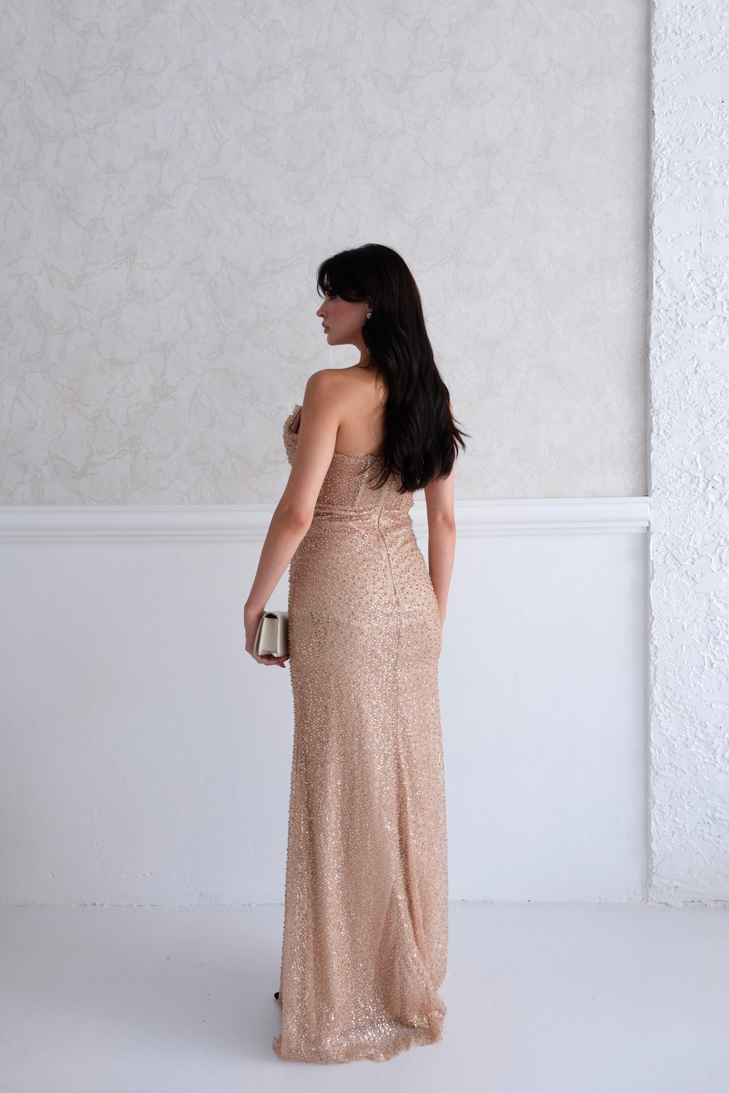 Gold Boncuk İşlemeli Straplez Transparan Detaylı Balık Abiye Elbise
