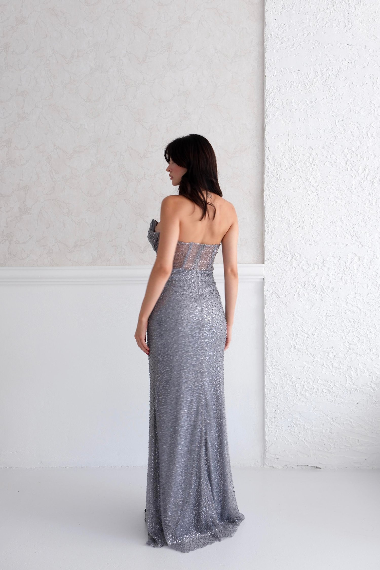 Gri Boncuk İşlemeli Straplez Transparan Detaylı Balık Abiye Elbise