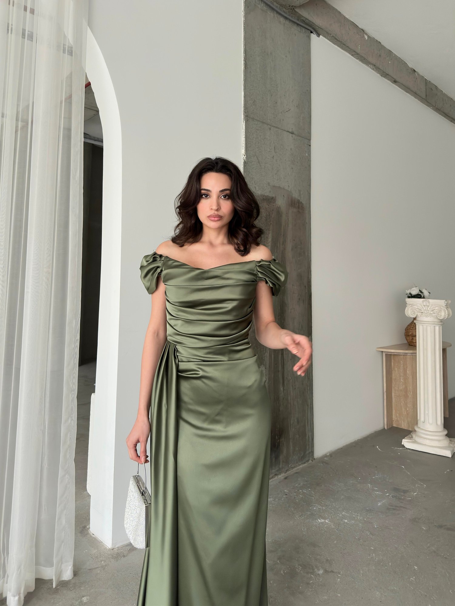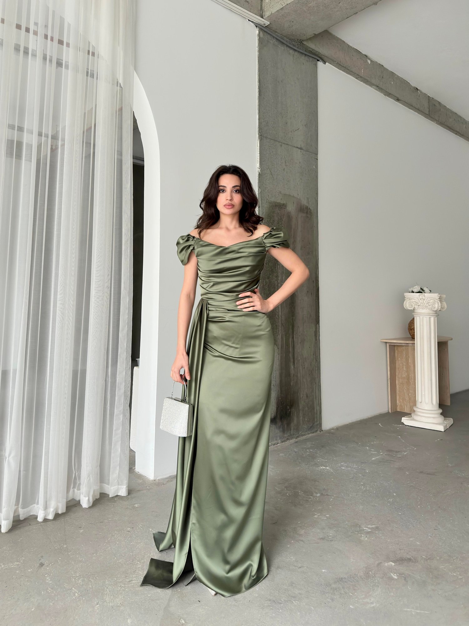 Haki Düşük Omuz Drapeli Abiye Elbise