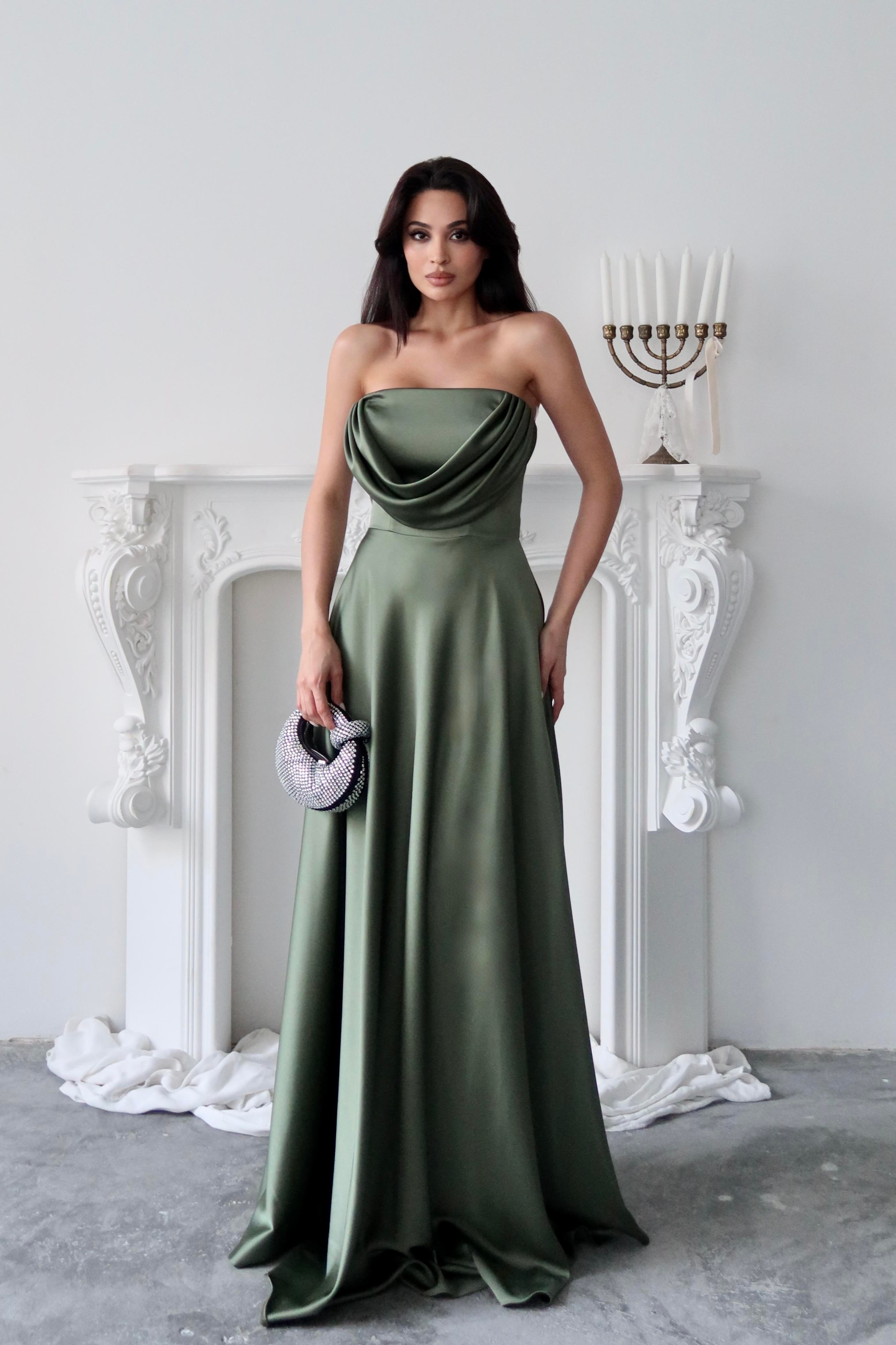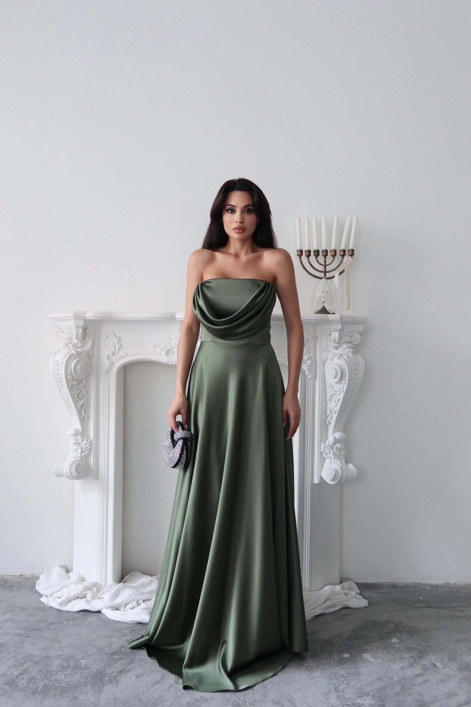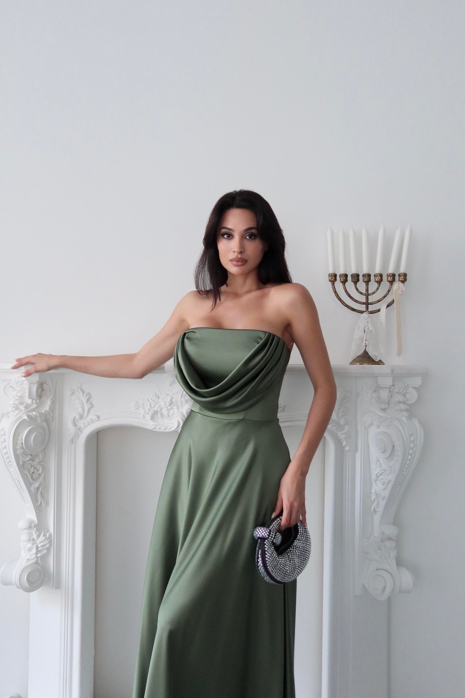 Haki Göğüs Drapeli Straplez Saten Abiye Elbise