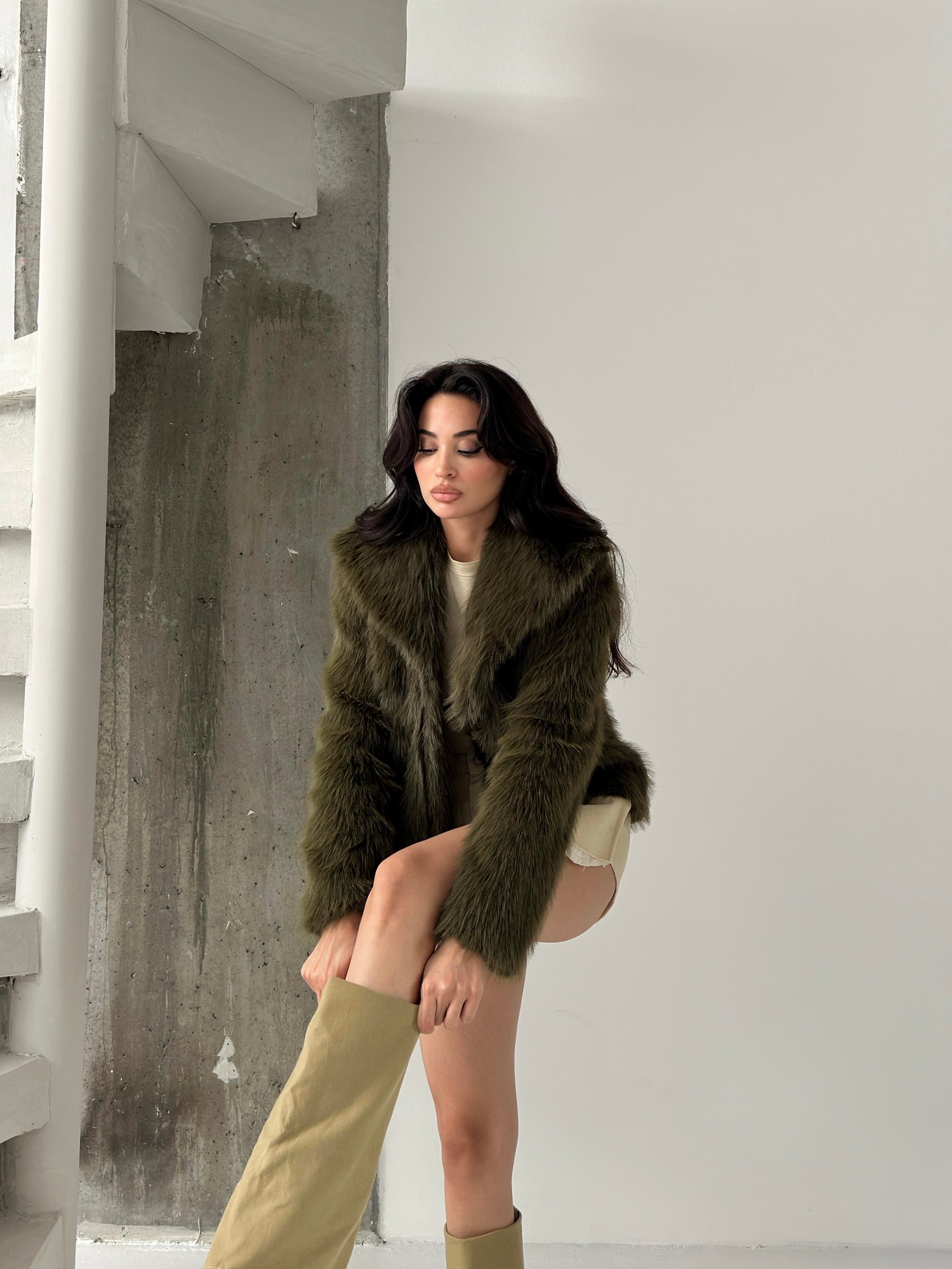 Haki Premium Astarlı Suni Kürk Kaban