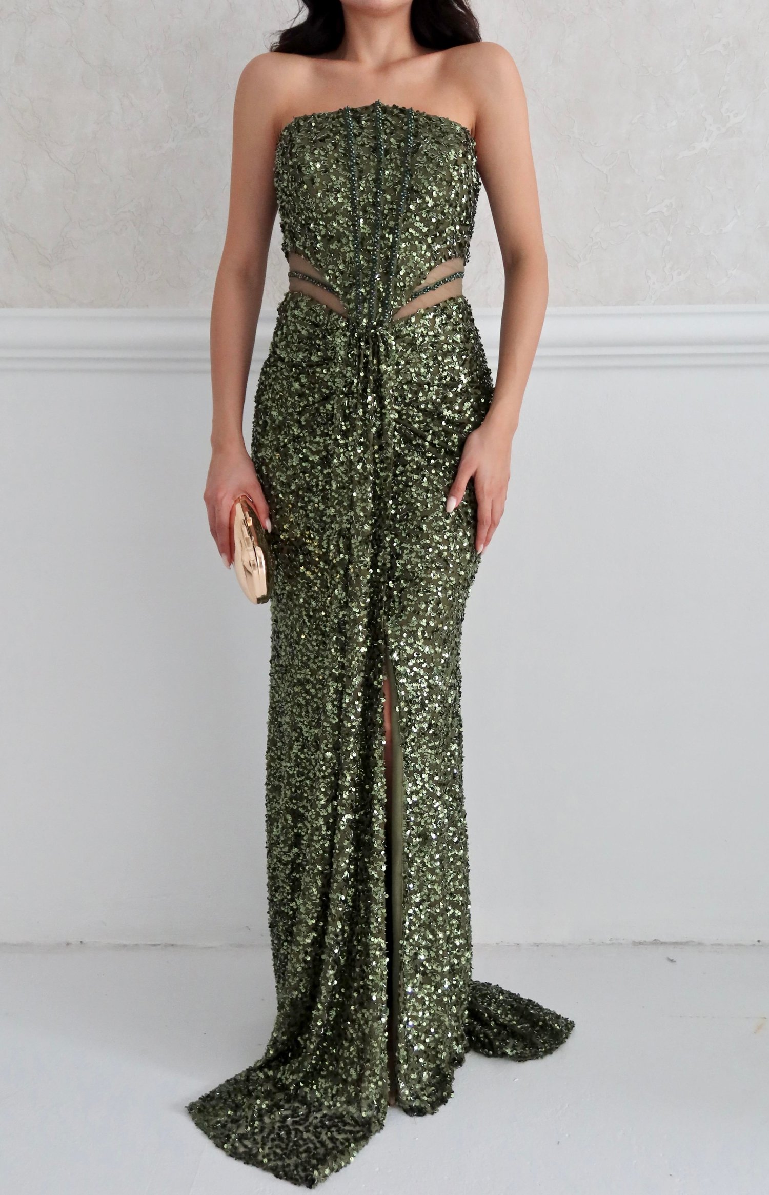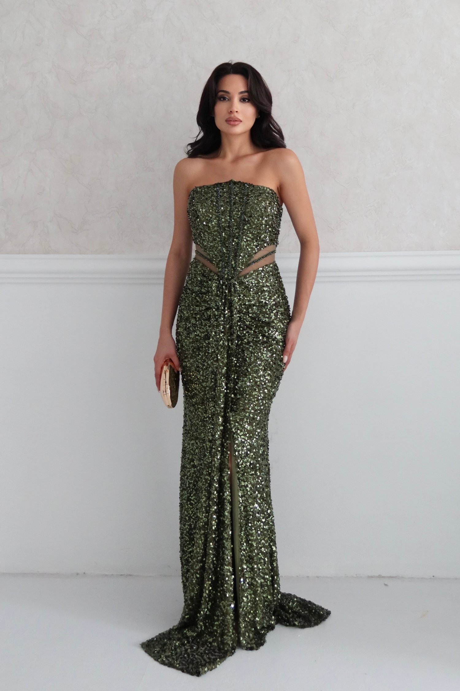 Haki Straplez Bel Detaylı Pul Payet Abiye Elbise